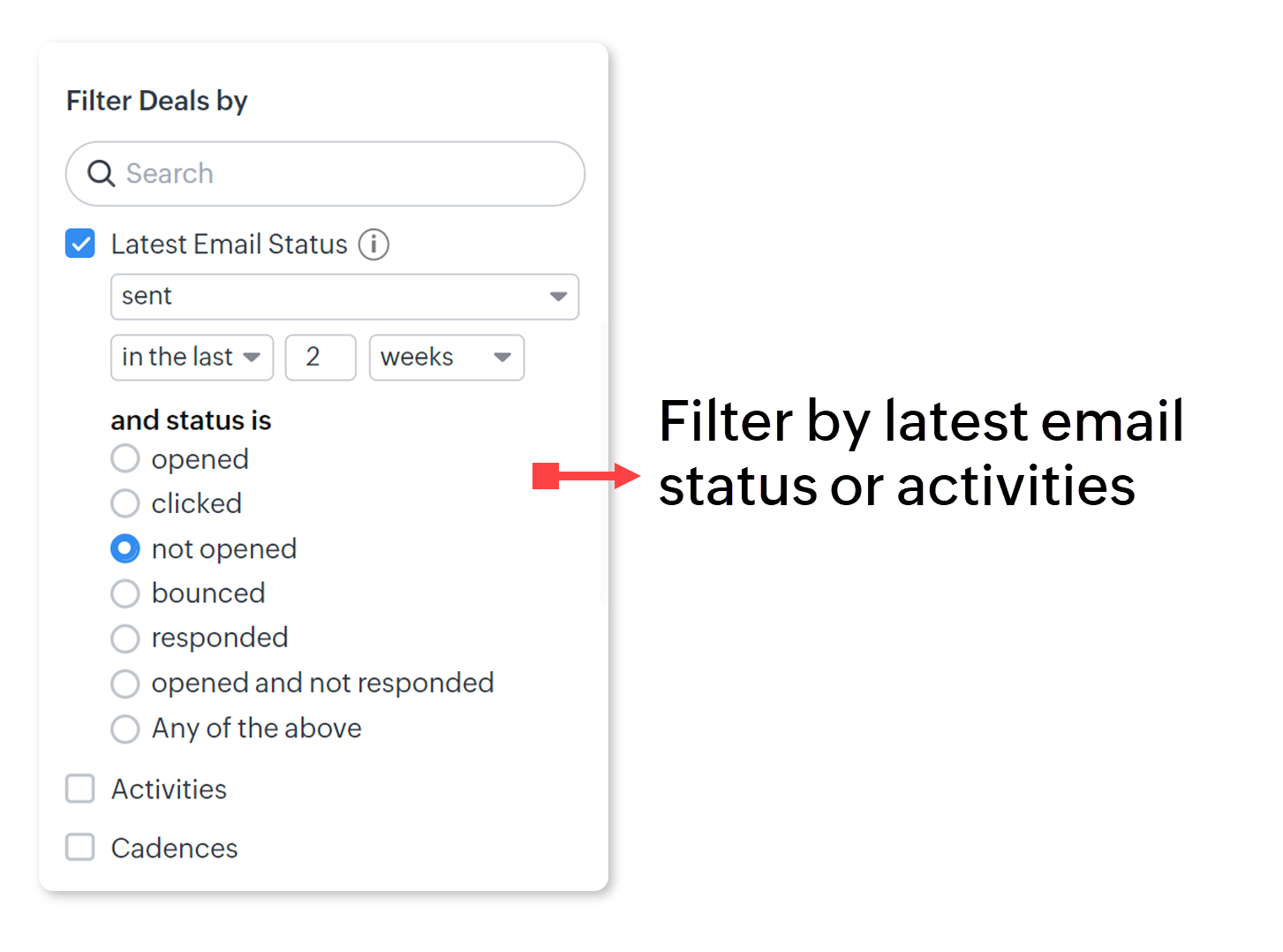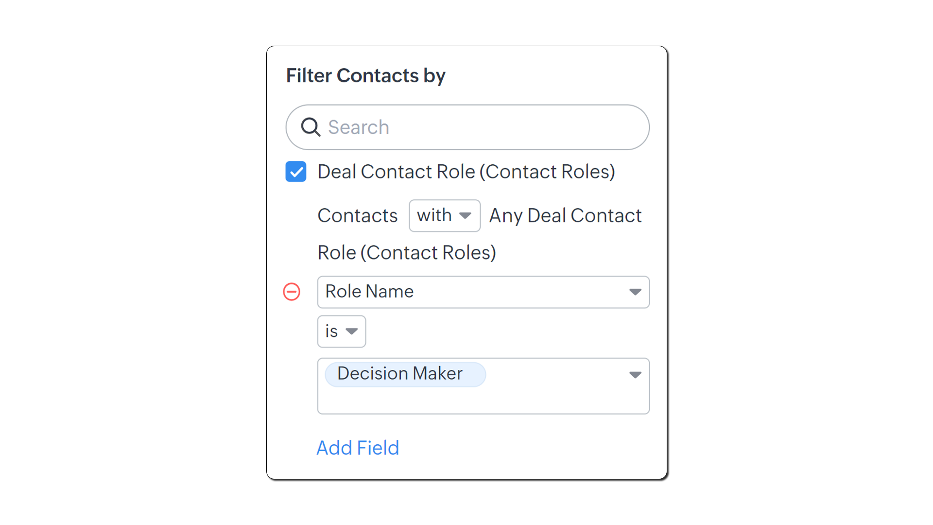 - Sub Filter Contacts By, selectează Deals > Contacts with Any Deals.
