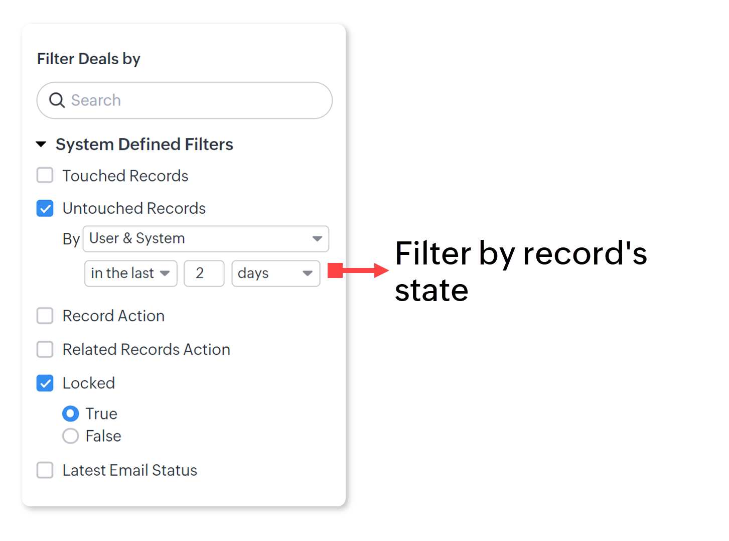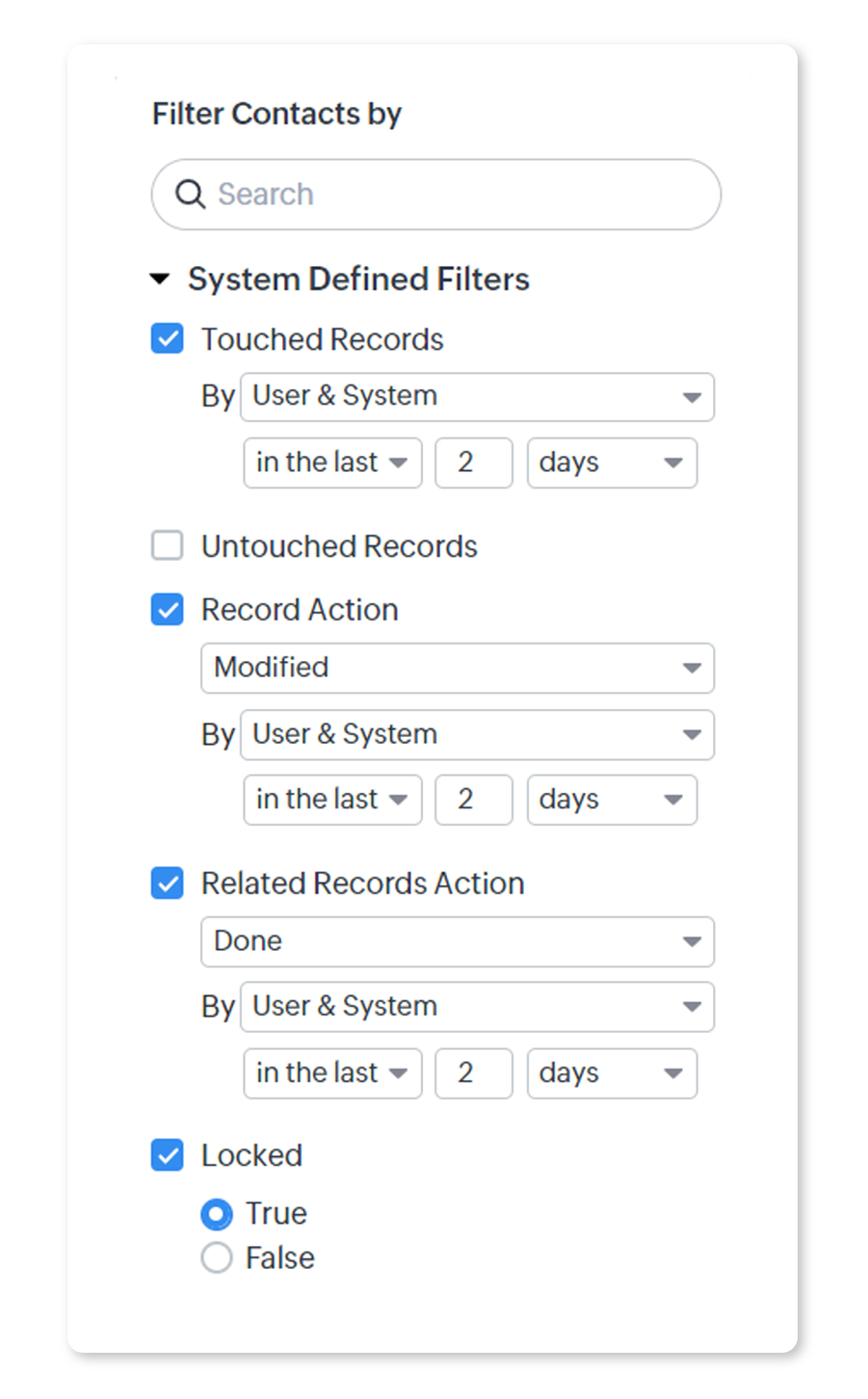 De exemplu, dacă rulezi acest filtru pe modulul Contacts și o ofertă asociată a fost editată în perioada specificată, acest contact va fi considerat și el „atins" sau prelucrat și va fi afișat în rezultate. - Untouched Records: Returnează înregistrările care nu au fost actualizate deloc.