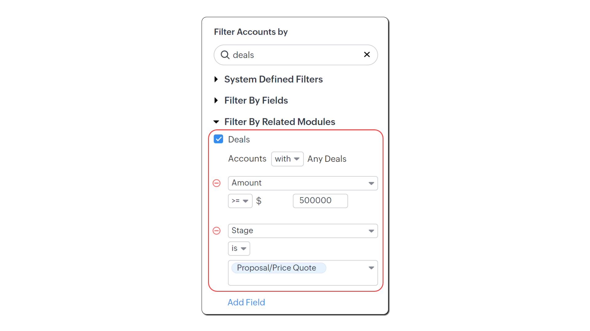 - Selectează Deal Amount >= 50.000