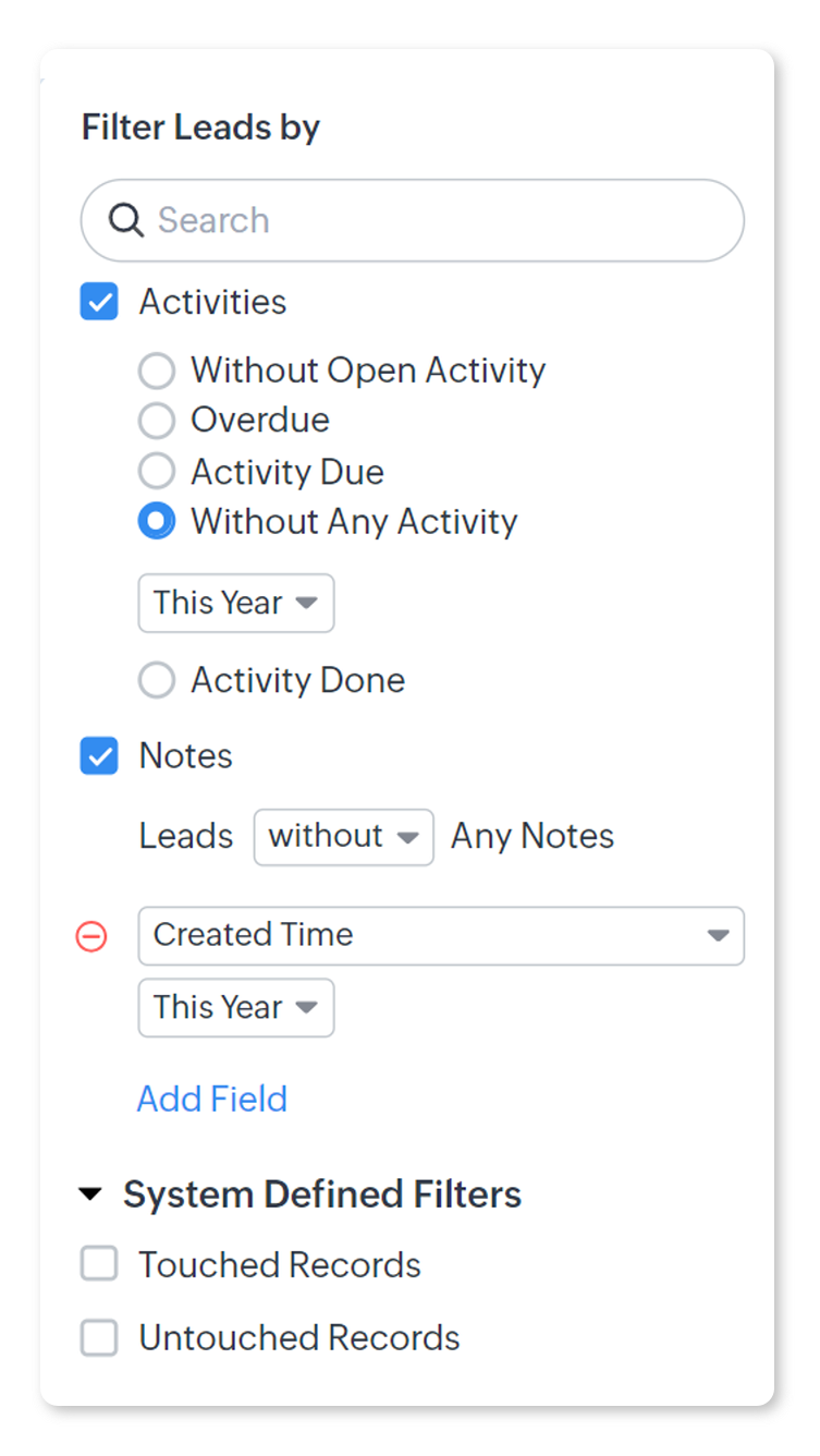 - Selectează Notes > Leads without Any Notes > Created Time > This year.Poți alege opțiuni suplimentare după necesități.
