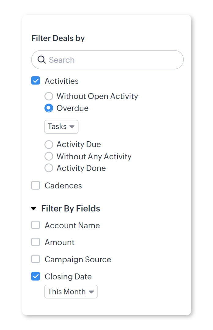Vrei să urmărești activitățile tale de vânzare, precum și pe cele ale subordonaților tăi. Cu filtrele avansate, poți restrânge toate ofertele cărora nu le este asociată nicio activitate pentru luna următoare, dar a căror dată de închidere se încadrează în luna curentă. Poți adăuga suma potențială ca un criteriu suplimentar, ceea ce va restrânge și mai mult căutarea.