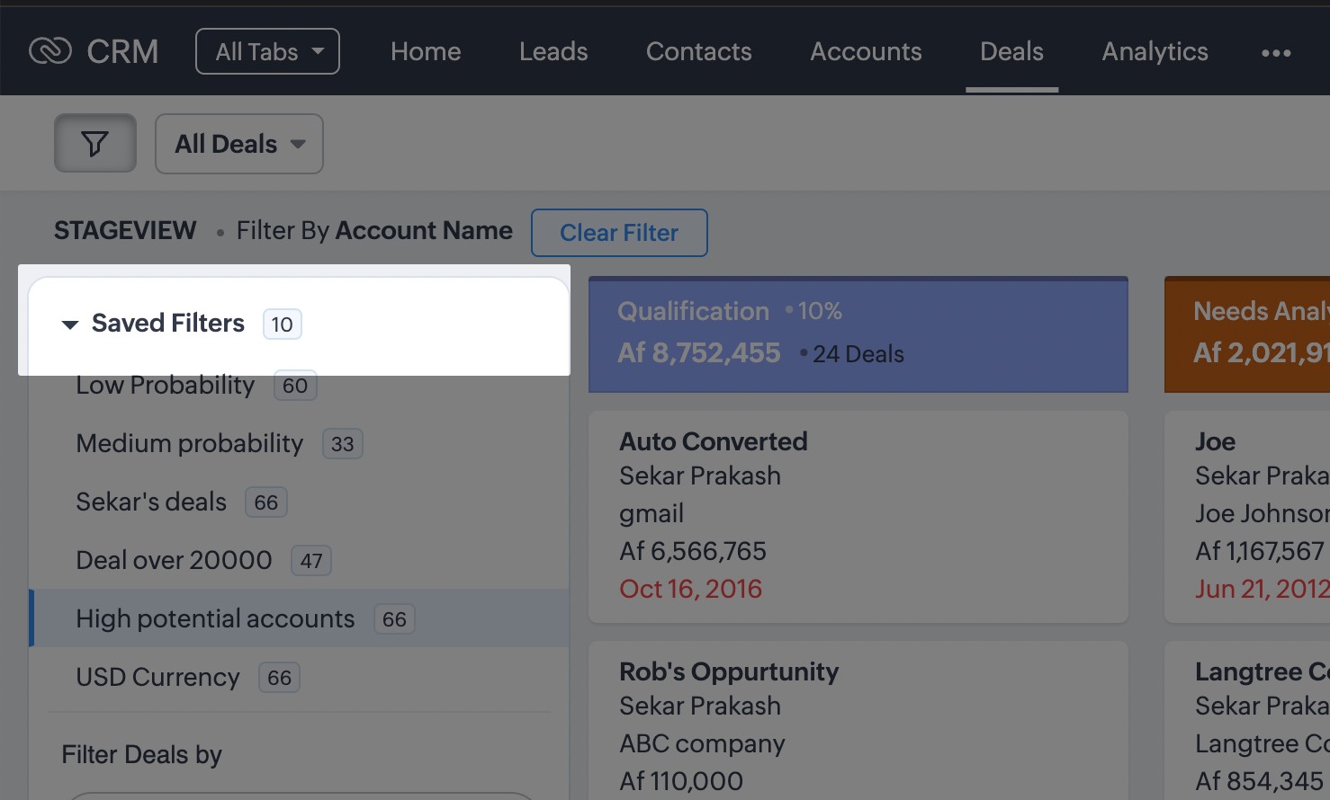 - Odată ce ai salvat filtrele, poți vedea numărul de înregistrări pentru fiecare filtru, care va fi actualizat în timp real.De exemplu, să zicem că ai salvat un filtru în modulul Deals numit „High-revenue deals". Pe măsură ce numărul de înregistrări care corespund criteriilor filtrului se modifică, numărul actualizat va fi afișat lângă numele filtrului.