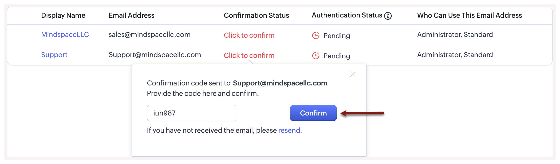 - Imediat ce un nou email al organizației este adăugat, un cod de confirmare va fi trimis la adresa de email specificată.