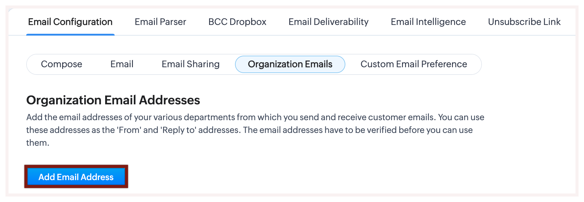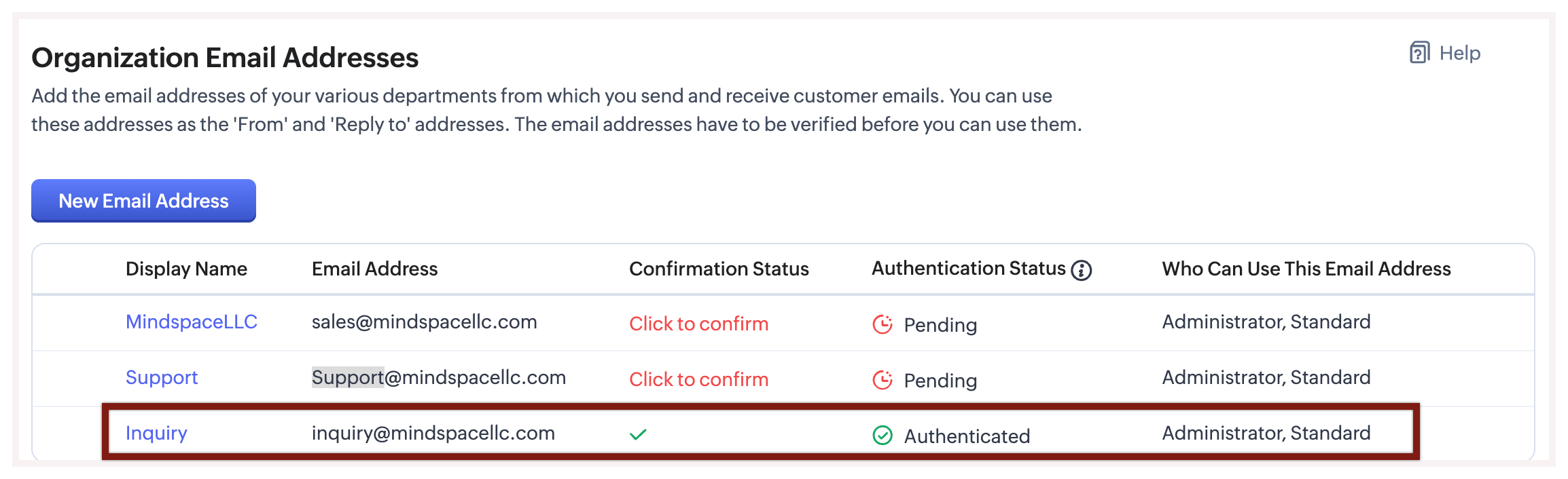 - În pagina Organization Email Addresses apasă pe + Add New Email Address.