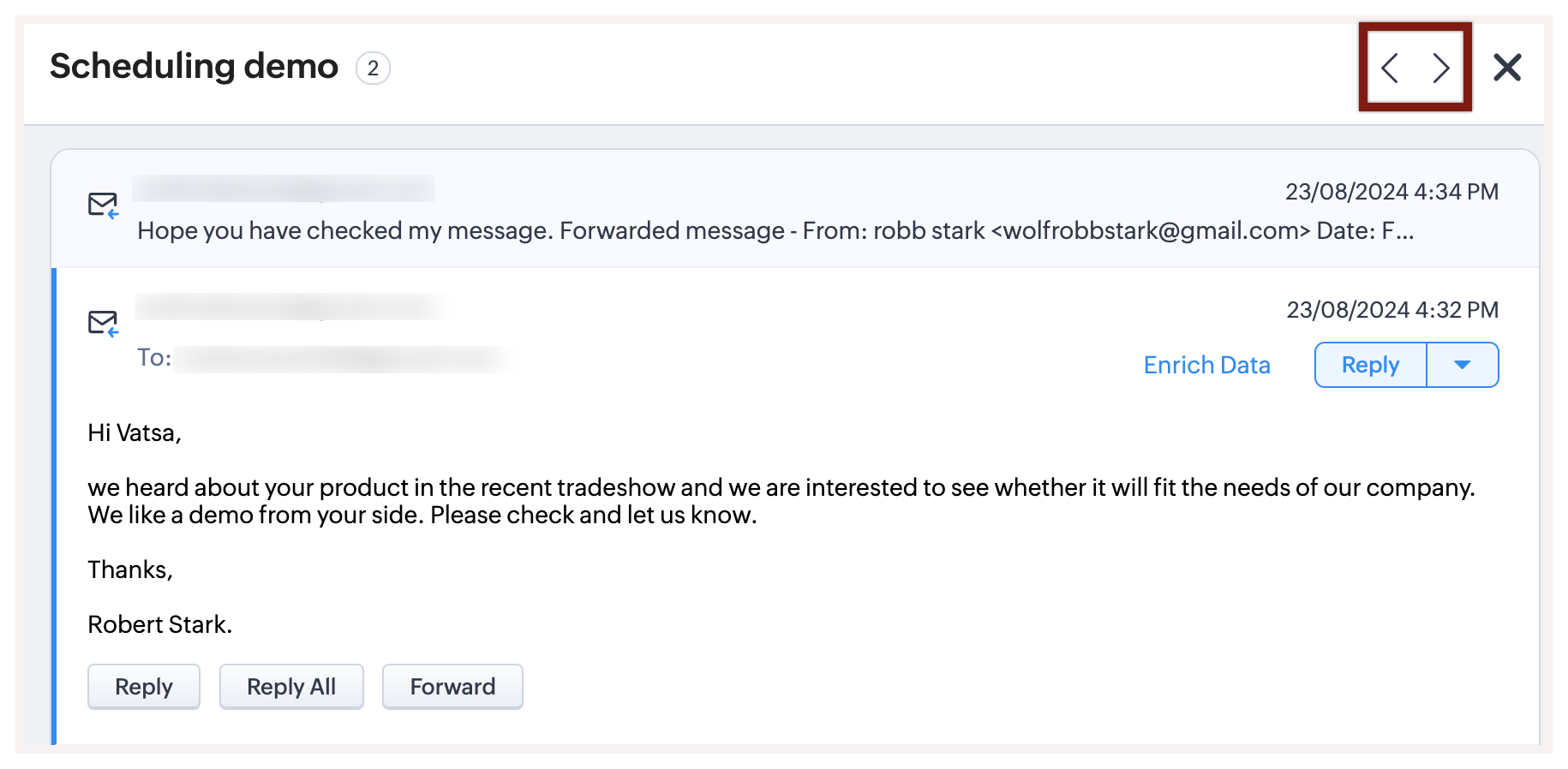 Zoho CRM îți oferă opțiunea de a vizualiza emailurile trimise de la/către emailul organizației.