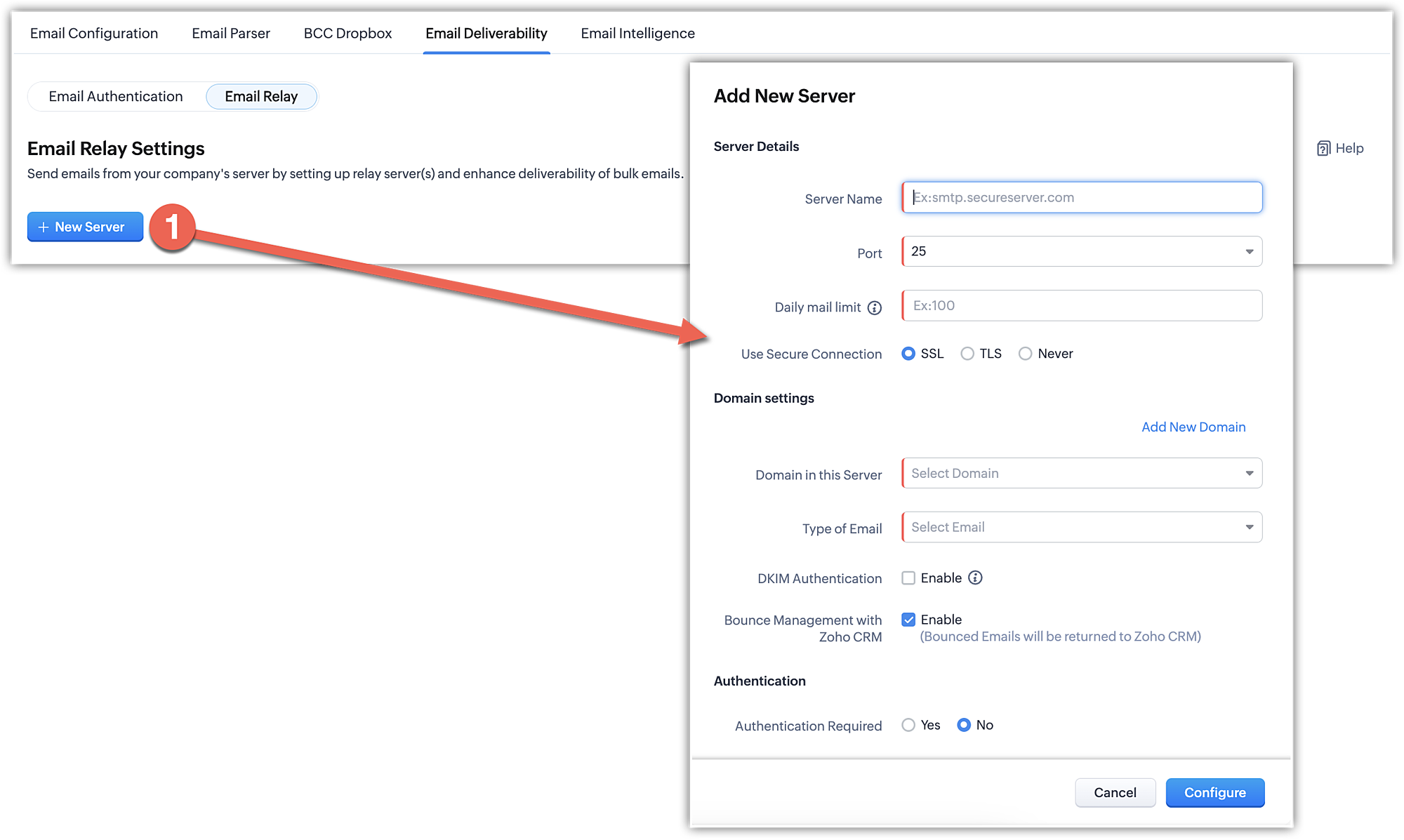 În pagina Email Relay Settings, apasă + New Server.