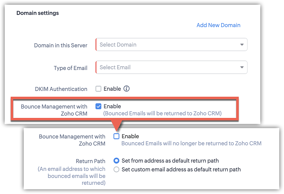 - Când serverul relay nu permite Zoho CRM ca cale de retur, utilizatorul ar trebui să dezactiveze Gestionarea respingerilor în opțiunea Zoho CRM și să seteze calea de retur ca serverul relay în două moduri: