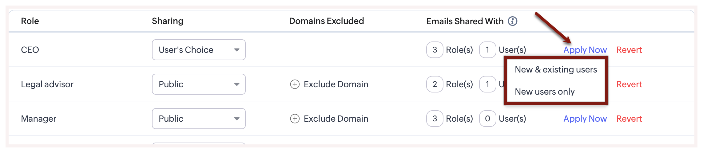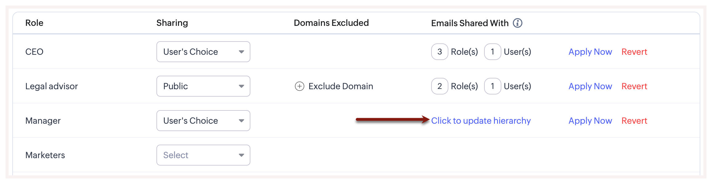 Astfel, de îndată ce unui utilizator i se atribuie un rol, permisiunea predefinită de partajare a emailurilor este aplicată automat. În plus, domeniile excluse și lista de utilizatori sau roluri cu care pot fi partajate emailurile vor fi de asemenea aplicabile.