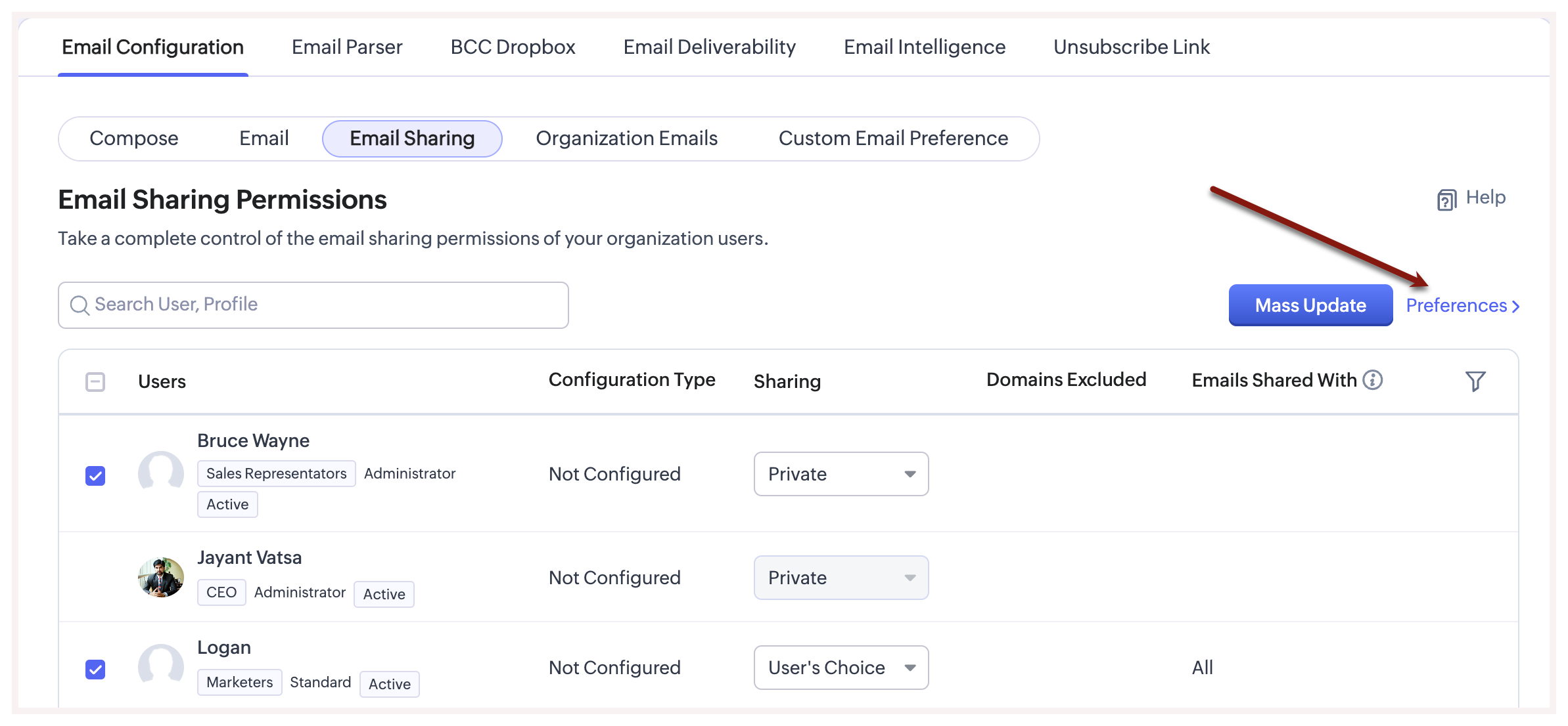 Când vine vorba de partajarea emailurilor, poate fi obositor să decizi și să setezi nivelurile de acces individuale ale fiecărui utilizator de fiecare dată când un utilizator nou se alătură organizației, schimbă departamentul sau este promovat într-un rol superior. Ca soluție, Zoho CRM are Preferințe de email, care facilitează configurarea permisiunilor de partajare a emailurilor, deoarece acestea sunt setate la nivel de rol.