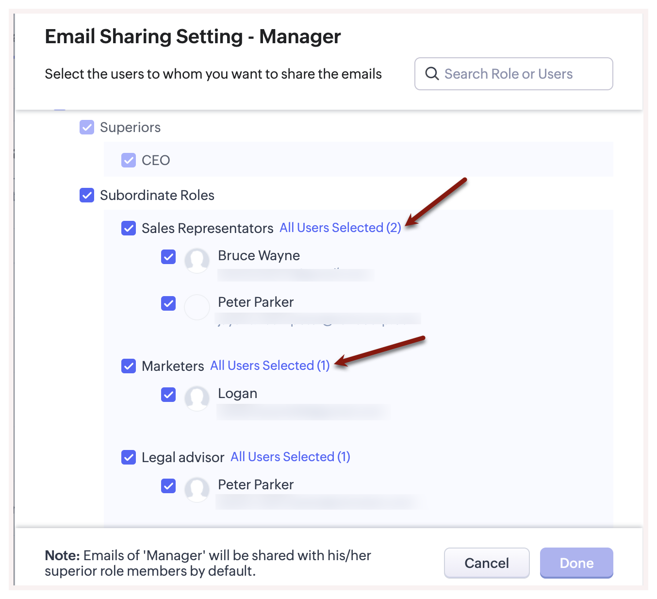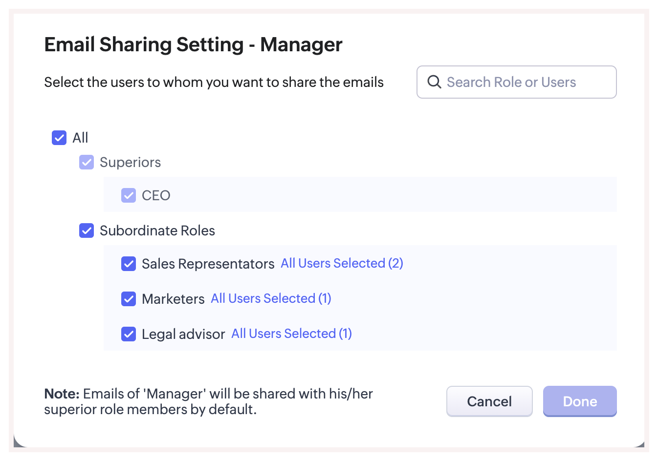 - Emailurile utilizatorilor dintr-un rol vor fi partajate cu membrii rolului superior imediat, în mod implicit. Aceasta nu poate fi modificată.