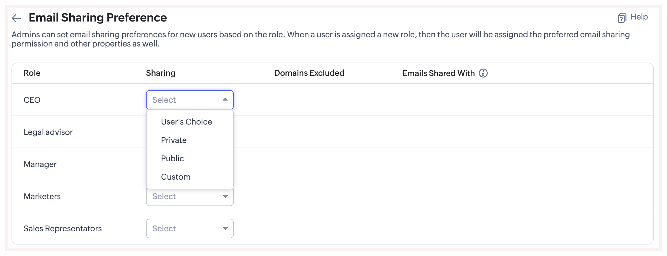 Preferința de email permite utilizatorilor cu profil de administrator să seteze permisiunile de partajare a emailurilor pe baza rolurilor. De exemplu, dacă organizația necesită ca toți Managerii Asistenți să partajeze emailurile cu colegii lor atunci când este nevoie, atunci este mult mai ușor să setezi permisiunea de partajare a emailurilor pentru acest rol ca Preferința utilizatorului. Astfel, orice utilizator care are rolul de Manager Asistent va avea același privilegiu.
