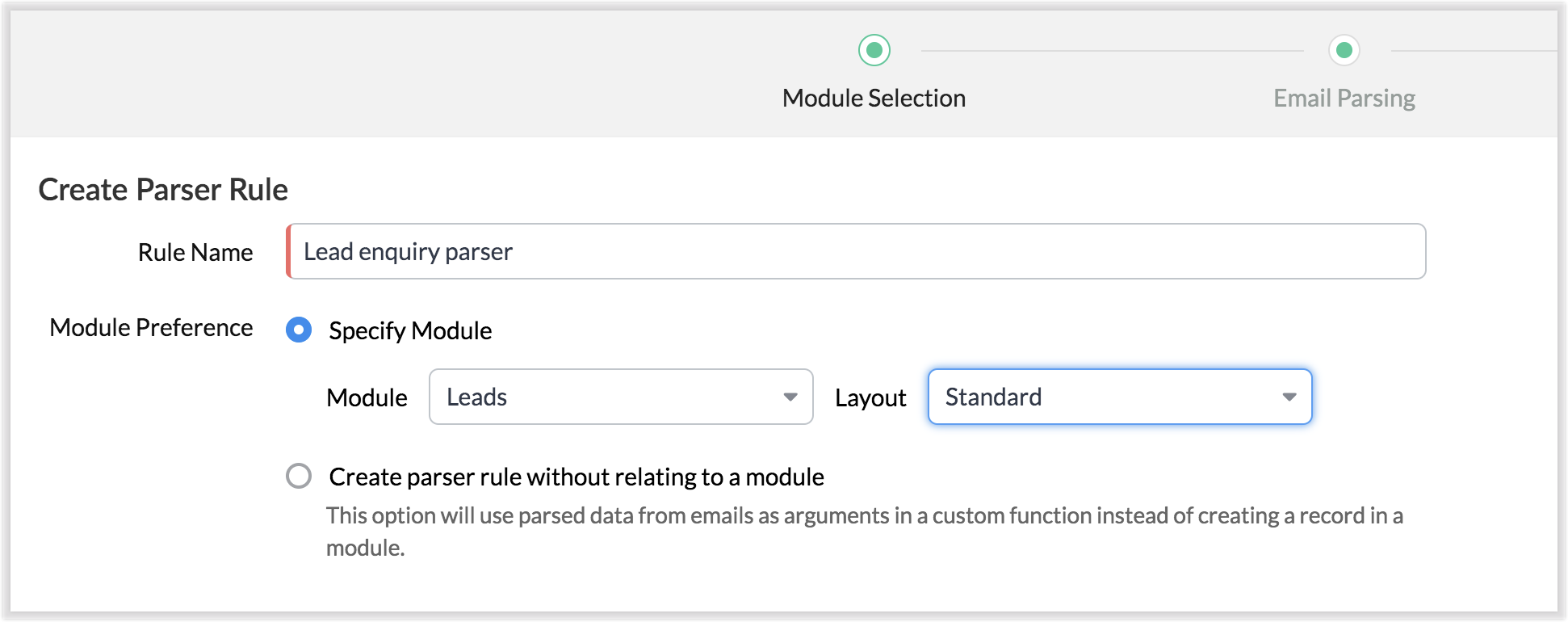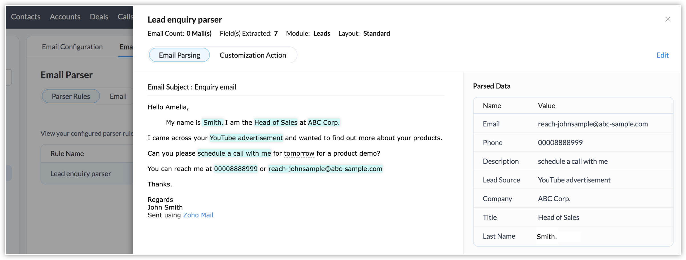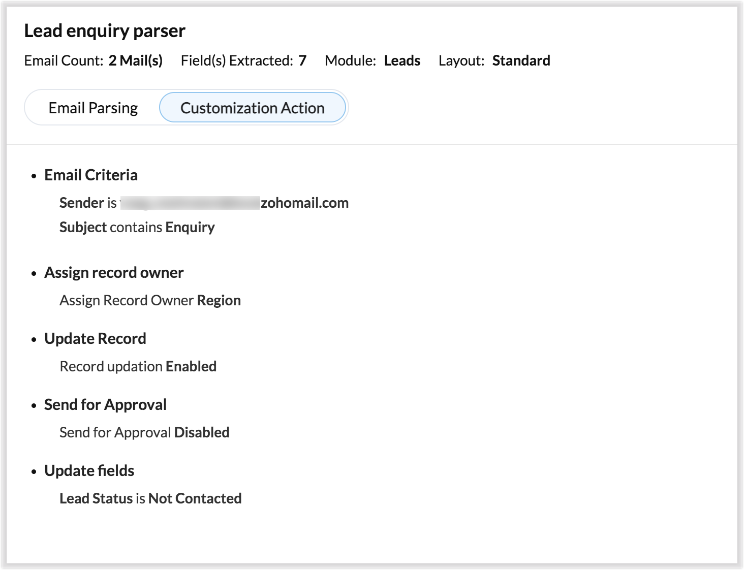 Zoho CRM îți permite să extinzi beneficiile email parser dincolo de capabilitățile standard folosind acțiuni personalizate. În mod tradițional, poți crea o regulă de parser doar pentru un singur modul la un moment dat. De exemplu, dacă ai configurat o regulă de parser Lead Enquiry, o poți asocia doar unui singur modul - să zicem modulul