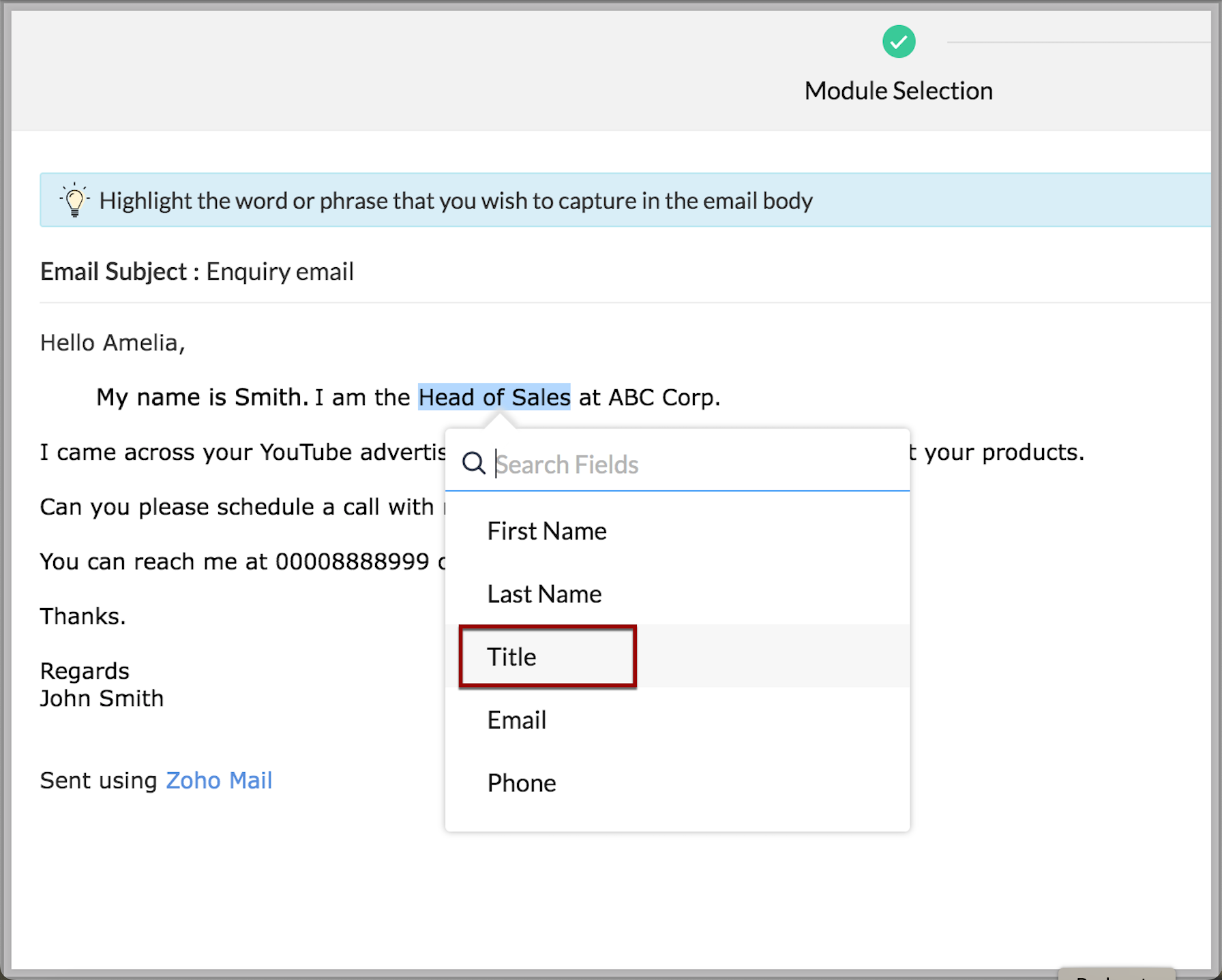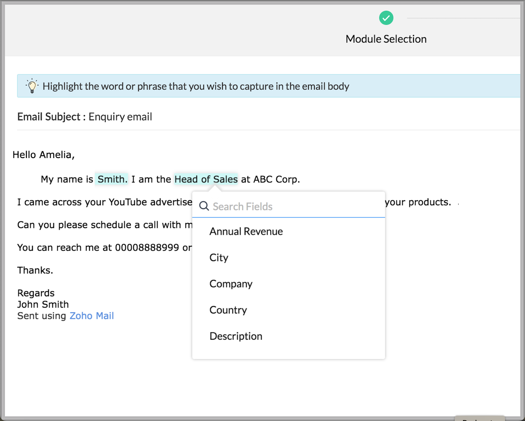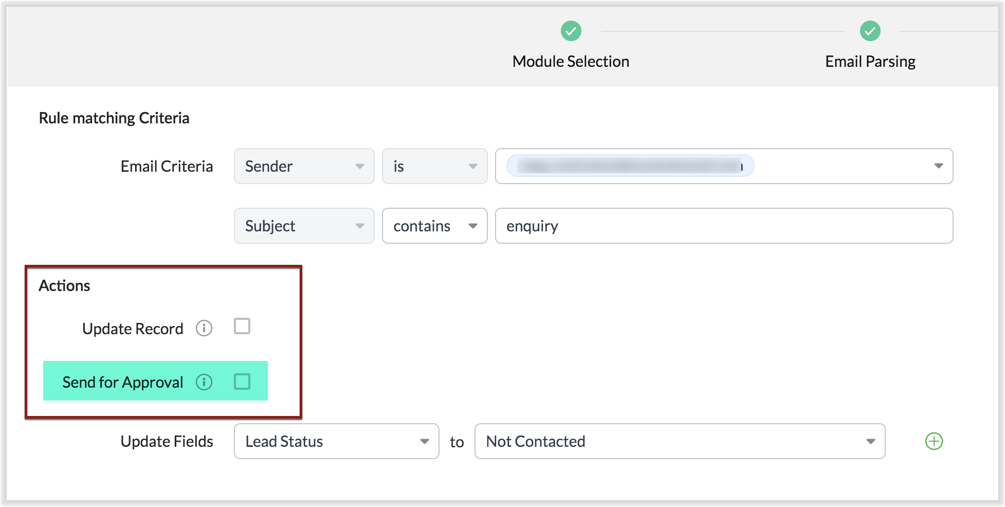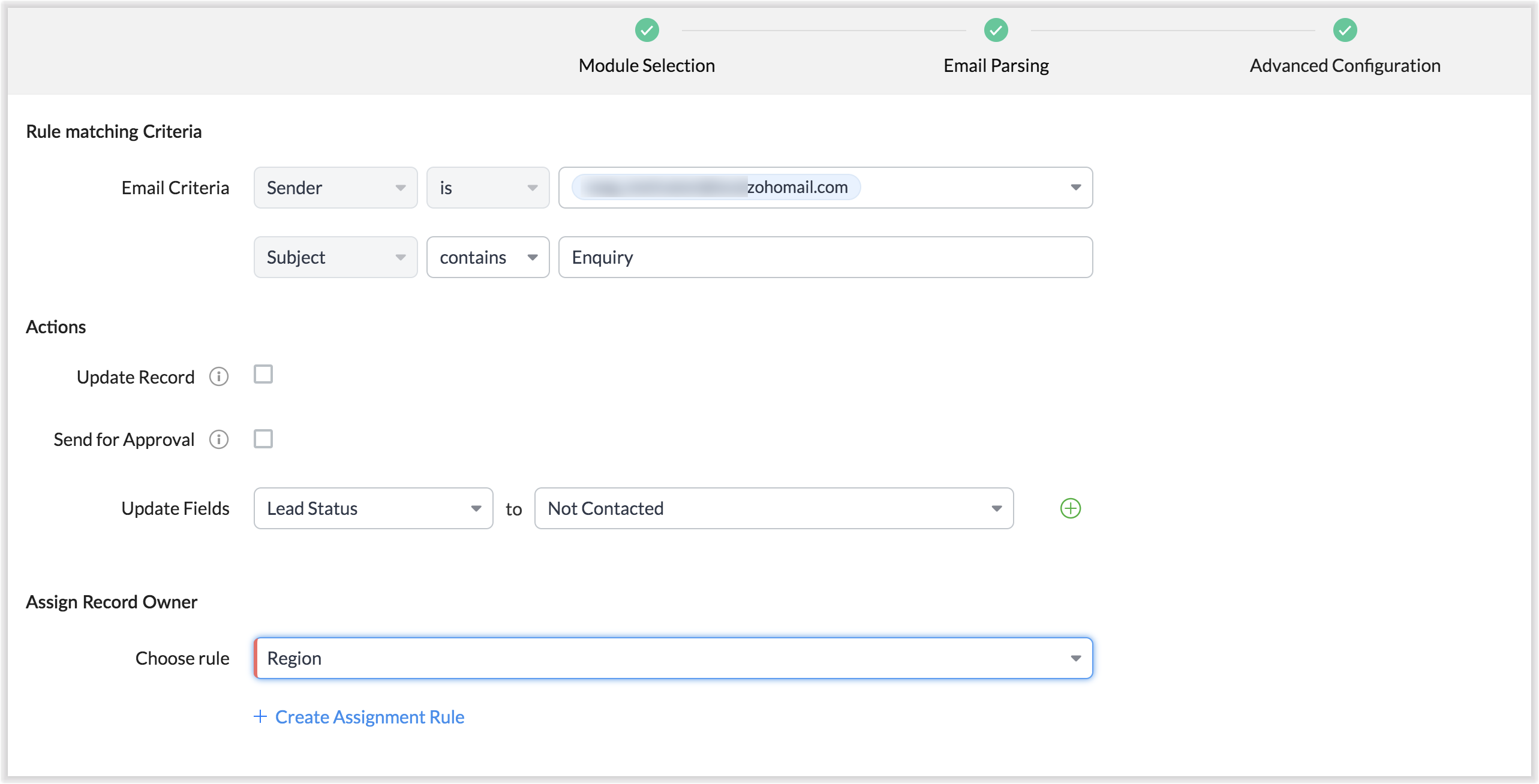 Zoho CRM îți permite să extinzi beneficiile email parser dincolo de capabilitățile standard folosind acțiuni personalizate. În mod tradițional, poți crea o regulă de parser doar pentru un singur modul la un moment dat. De exemplu, dacă ai configurat o regulă de parser Lead Enquiry, o poți asocia doar unui singur modul - să zicem modulul