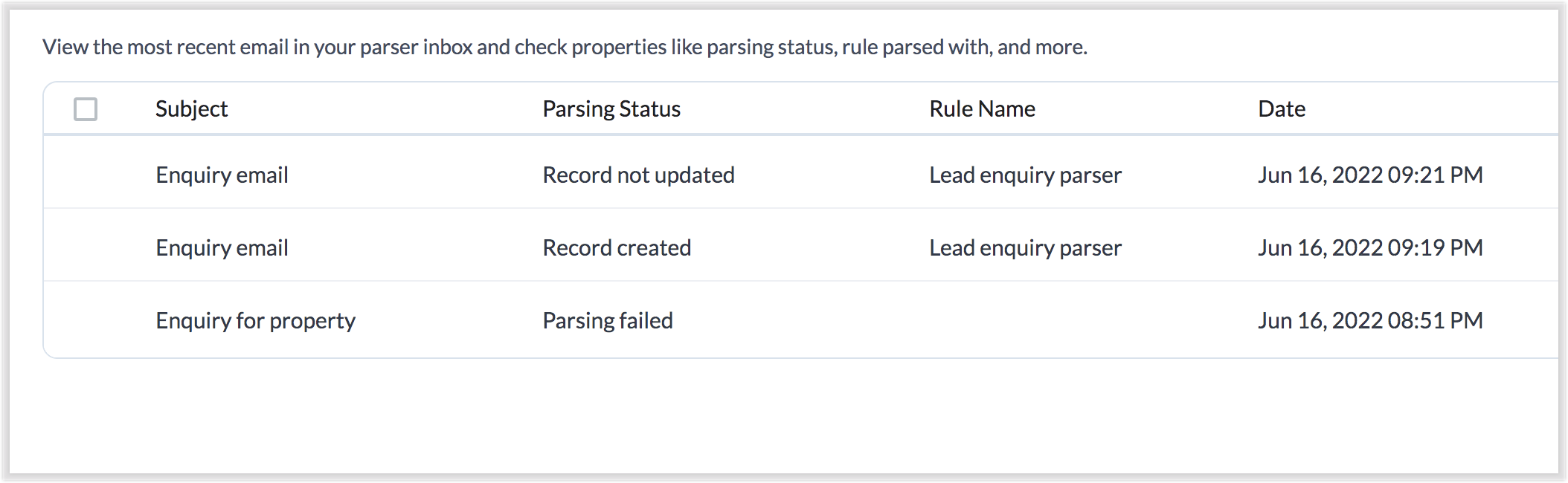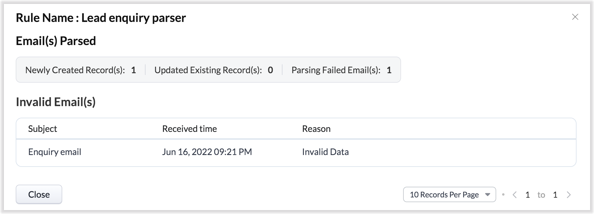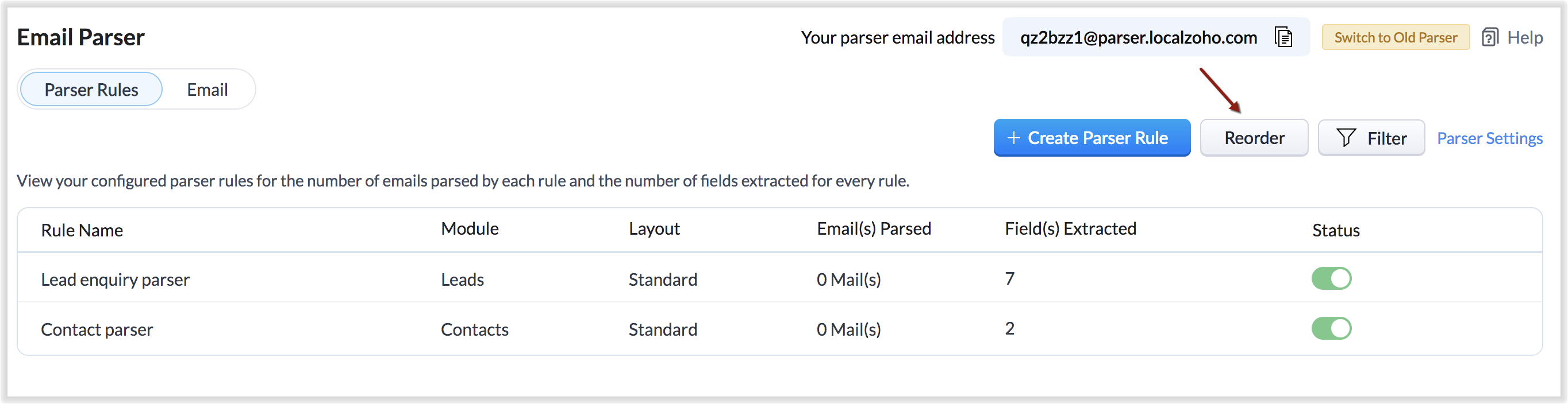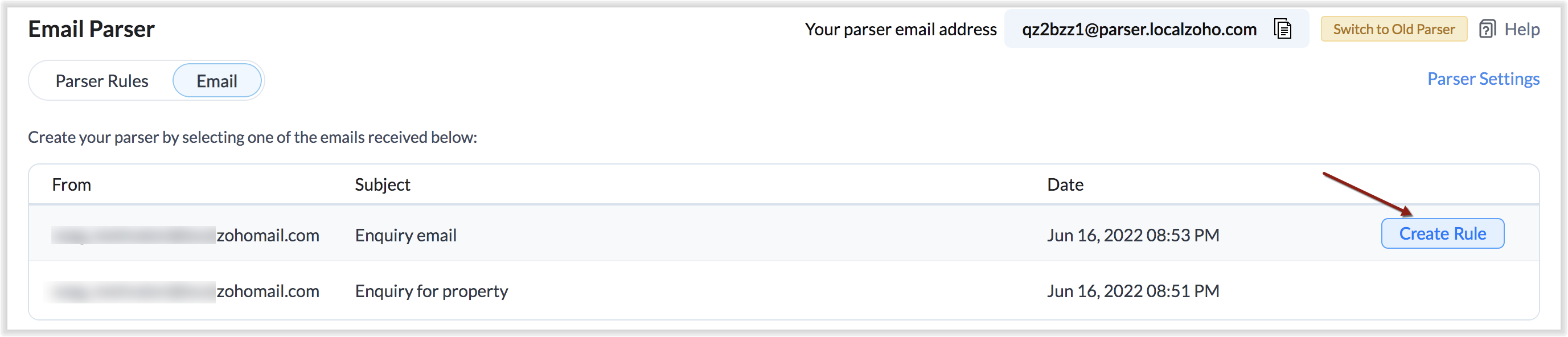 Odată ce ai e-mailuri primite prin ID-ul de e-mail al parser-ului, înregistrările vor fi create conform regulilor de parser.