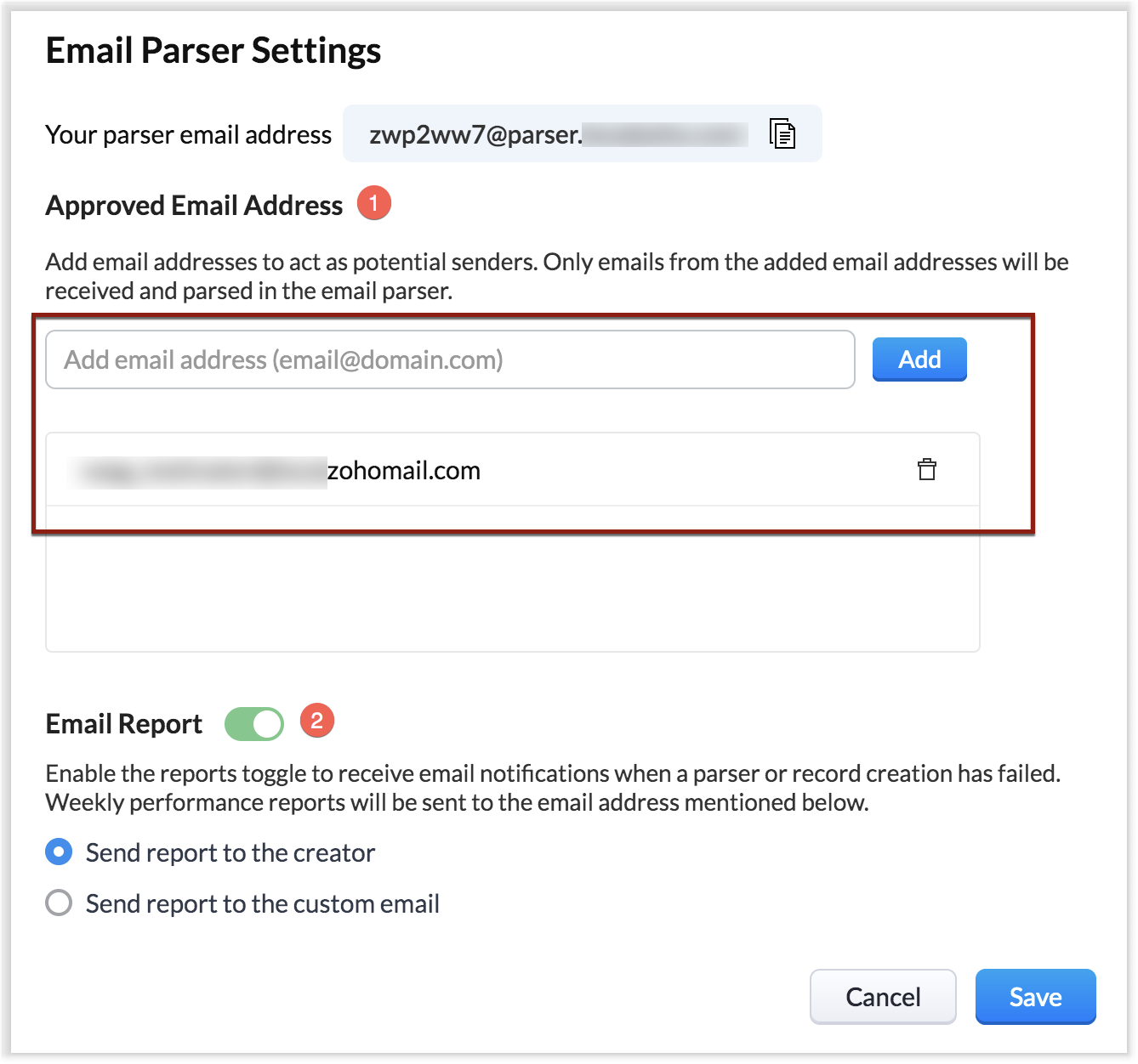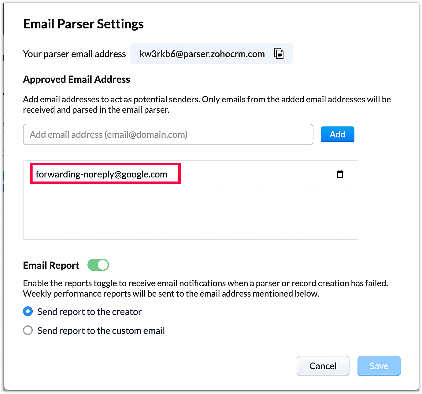 Poți adăuga maximum 20 de adrese de e-mail ca ID-uri aprobate de la care e-mailurile pot fi trimise către ID-ul de parser. Aceasta poate fi adresa organizației tale, propria ta adresă de e-mail, ID-ul managerului tău - orice adresă de e-mail de la care informațiile despre clienți trebuie parsate în CRM. -
