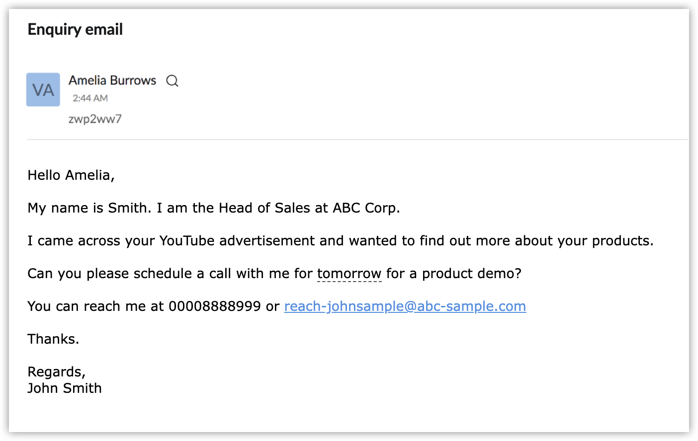 De exemplu, presupune că trimiți următorul e-mail către ID-ul de parser. Acesta conține numele expeditorului, compania lor, numărul de telefon, ID-ul de e-mail și ce caută. Acestea sunt puncte de date tipice pentru un prospect. Completează un e-mail care conține valori pentru toate câmpurile pe care le consideri obligatorii și trimite acel e-mail către ID-ul de parser.