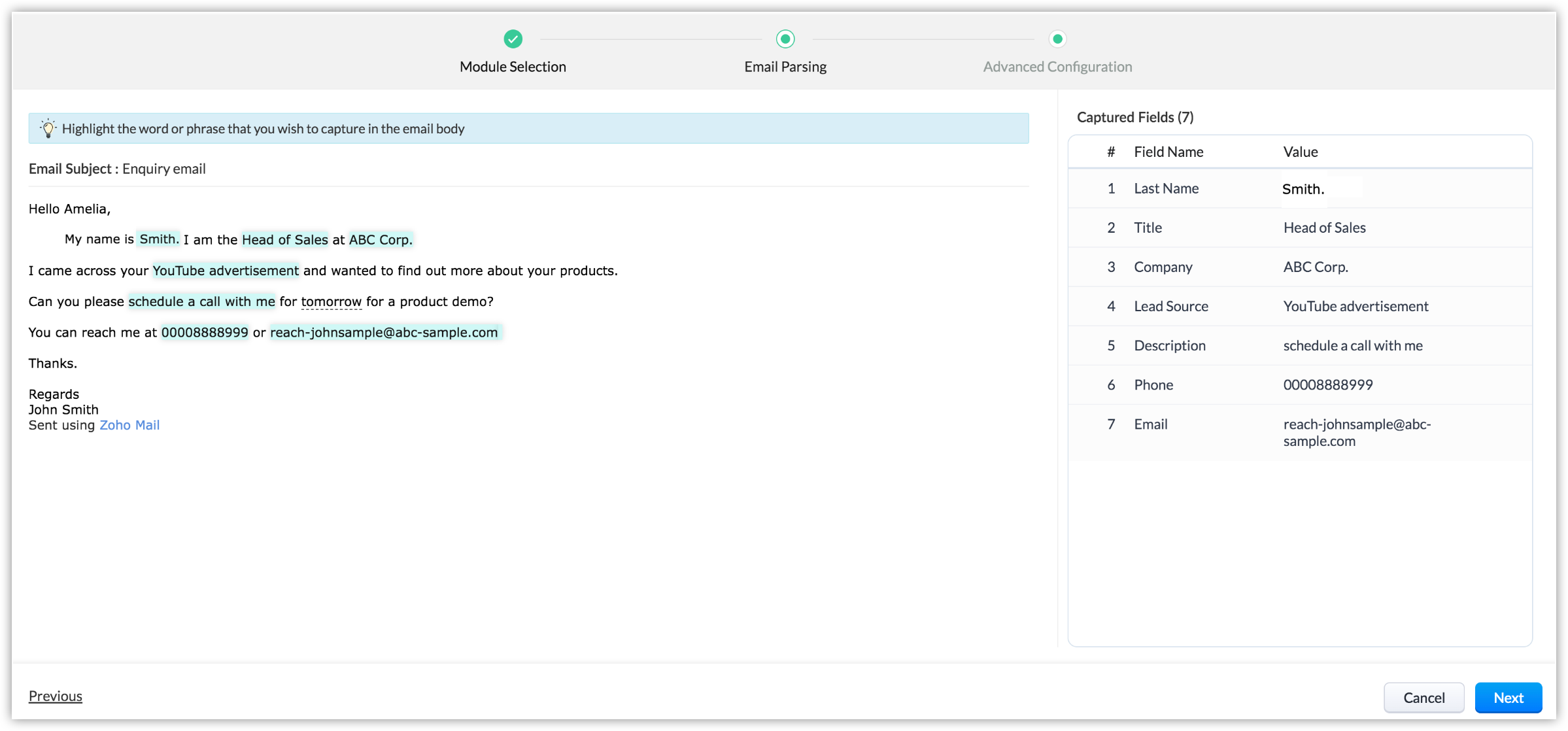 S-ar putea să existe o nevoie specifică pentru care folosești email parser - de exemplu, generarea de lead-uri din solicitări, parsarea informațiilor despre tranzacții, informații despre furnizori și așa mai departe. Trebuie să trimiți un e-mail șablon către ID-ul de parser mai întâi, pentru a iniția maparea câmpurilor și a identifica punctele de date pentru parsare. Acest e-mail este în mod ideal unul care conține toate detaliile care pot fi mapate la un modul.
