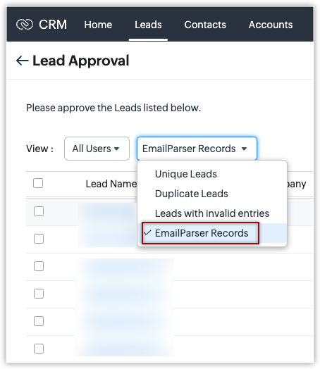 În pagina Leads Approval, selectează EmailParser records din lista derulantă. Toate înregistrările create prin email parser sunt listate. Poți aproba manual pe cele dorite, iar aceste înregistrări vor face acum parte din baza de date CRM.