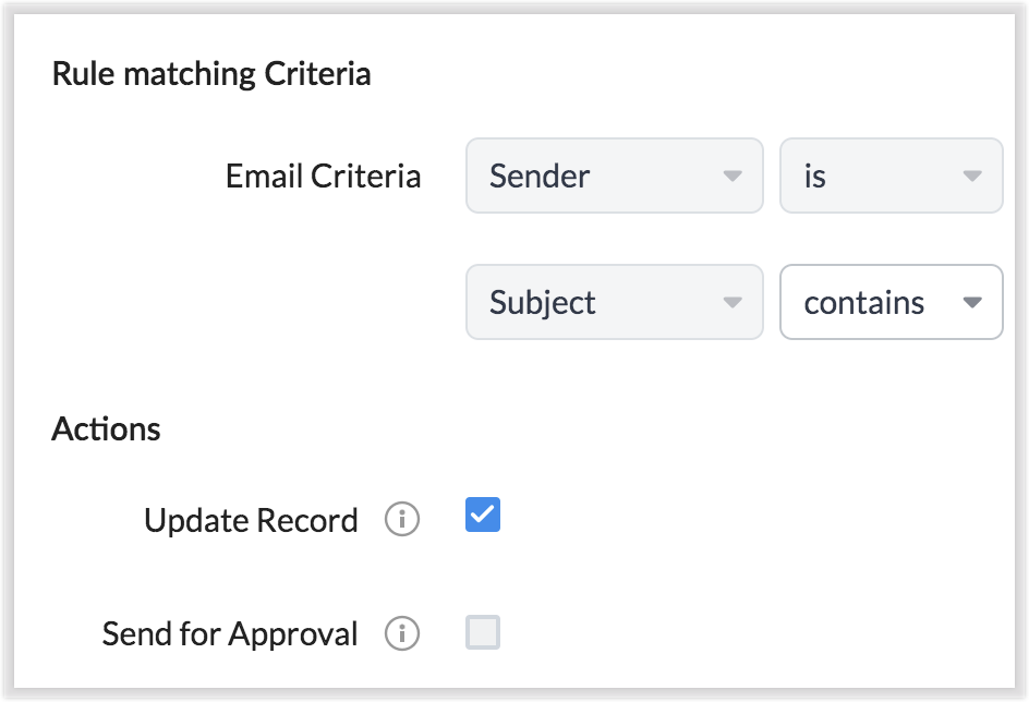 Folosind email parser, poți, de asemenea, actualiza înregistrările CRM cu cele mai recente valori. De exemplu, ai generat un lead numit John Smith cu câțiva parametri de lead. Când John trimite din nou un e-mail cu un număr de telefon actualizat, acest număr va fi înlocuit în înregistrarea lui John. CRM potrivește câmpul unic (e-mail) și recunoaște că e-mailul primit se referă la o înregistrare existentă și, prin urmare, înlocuiește valorile cu cele mai recente.