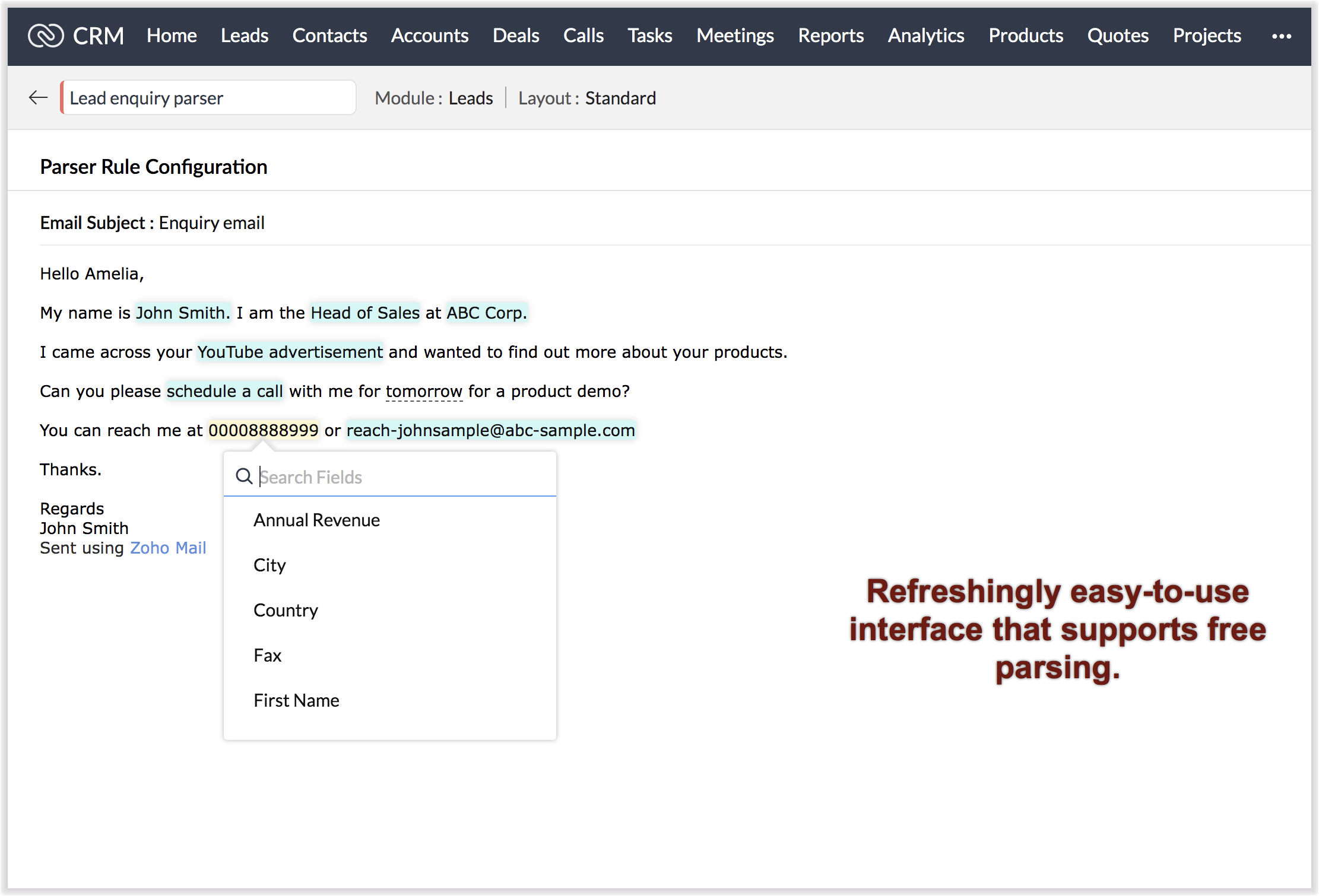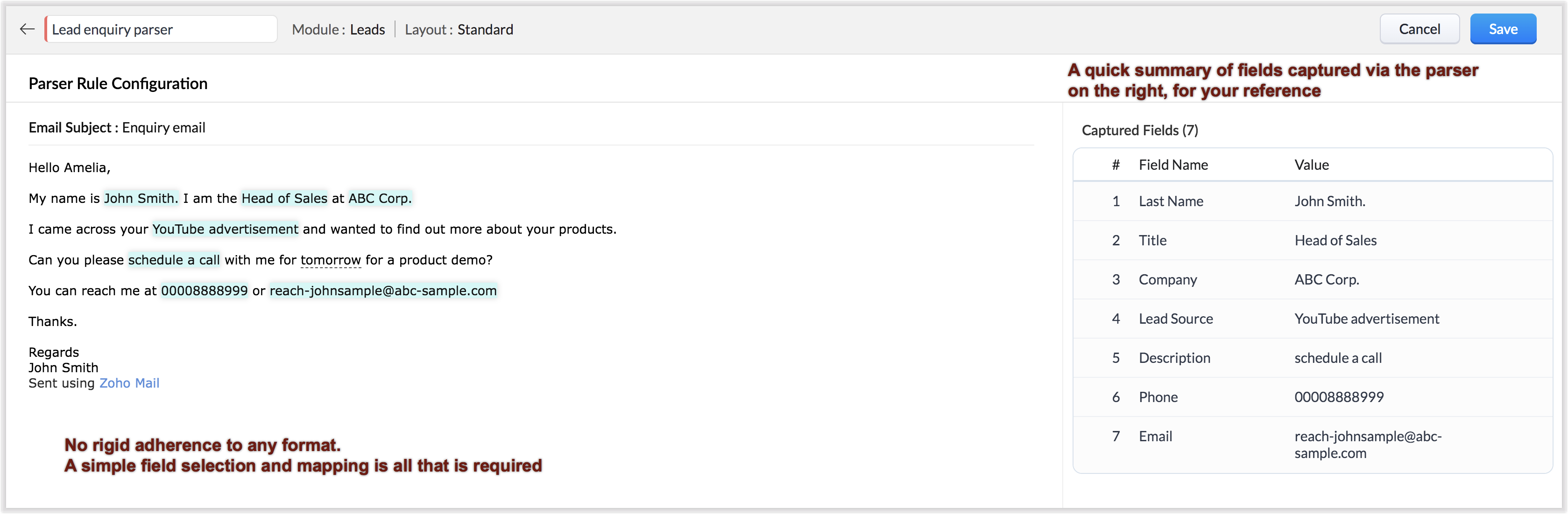 Email parser este un instrument de extragere a datelor din Zoho CRM care ajută o organizație în diverse funcții de business, cum ar fi generarea de lead-uri, actualizarea informațiilor și activitățile de follow-up cu clienții. Este conceput pentru a automatiza procesul de adăugare a înregistrărilor în Zoho CRM prin extragerea informațiilor din email-urile primite. Sursa datelor este email-ul, iar destinația sunt modulele tale CRM. Cu ajutorul email parser-ului, poți automatiza adăugarea cererilor de lead-uri și modificarea informațiilor actualizate despre lead-uri primite prin email.