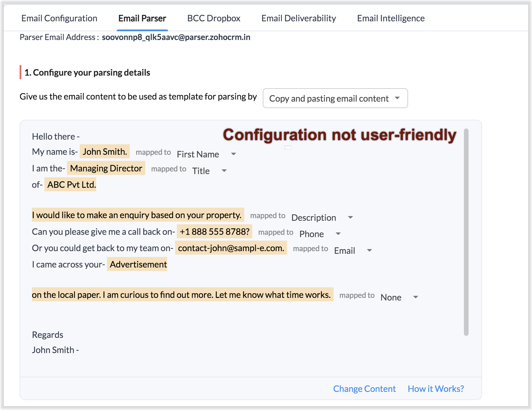 De exemplu, o companie de administrare a proprietăților dorește să actualizeze atât înregistrările de Contact, cât și cele de Account dintr-un email primit — aceasta indică extensibilitate. O companie de administrare a proprietăților dorește să actualizeze statusul unui anunț pe un site terț pe baza conținutului unui email primit de la un client. Acest lucru sugerează nevoia de interoperabilitate. Odată ce ai funcțiile personalizate necesare scrise, poți asocia funcția necesară regulii parser-ului și ai acțiunea executată pentru email-urile primite ulterior.