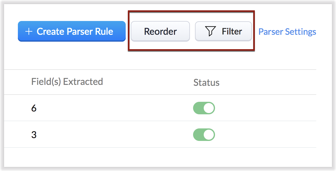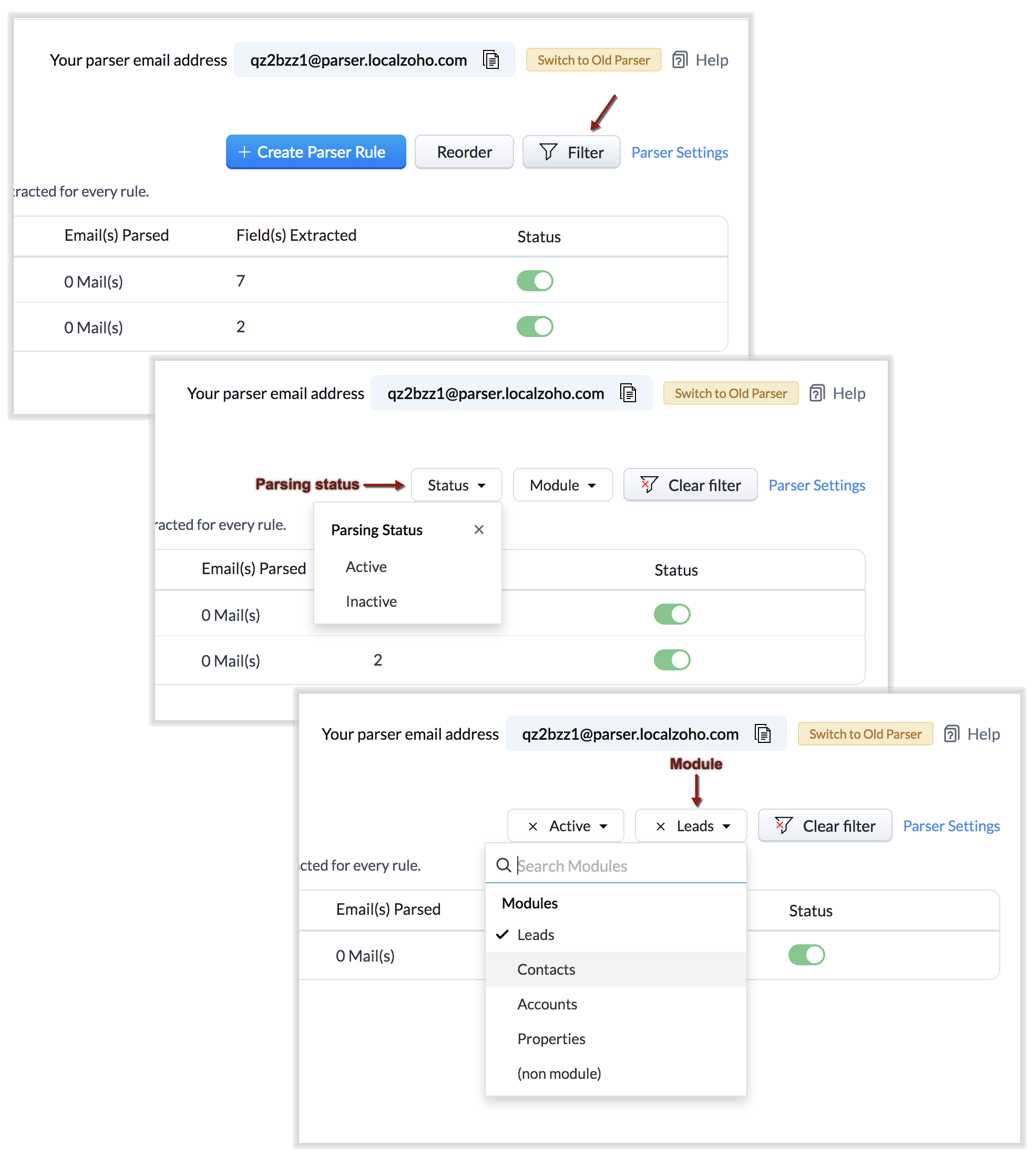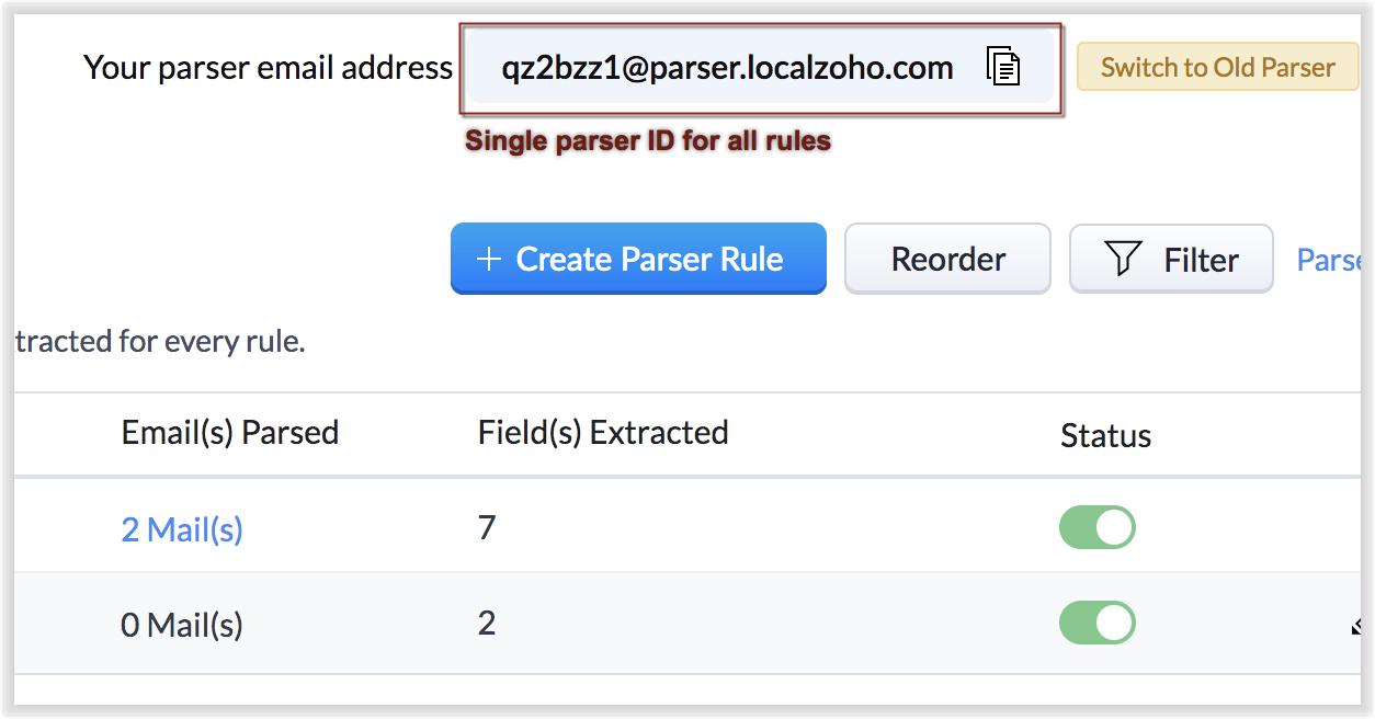 Dacă un singur email ar îndeplini două reguli de parser, regula listată prima se execută. Prin urmare, poți reordona regulile în funcție de ordinea de preferință. Poți, de asemenea, filtra regulile după status (activ/inactiv) și după modul.