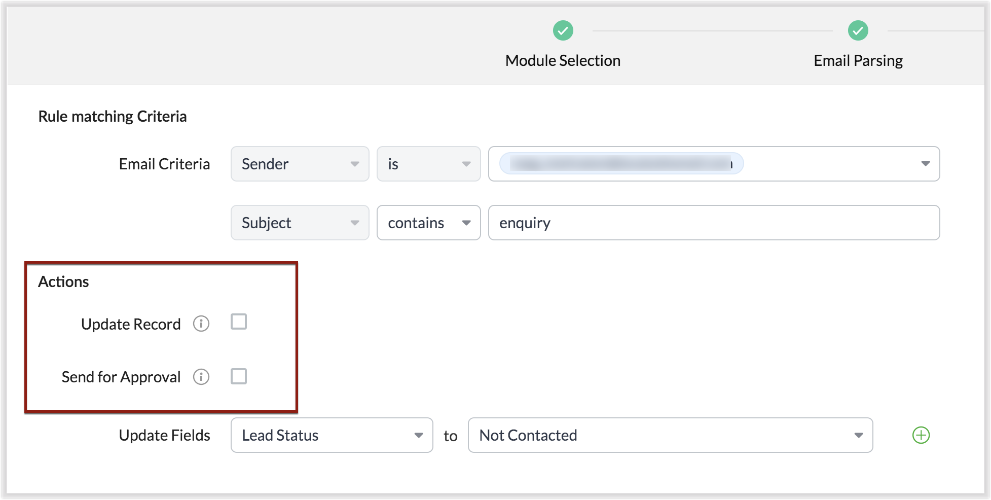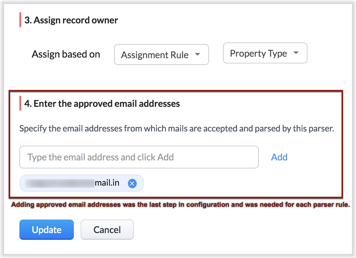 Actualizare Înregistrare este o funcție cu ajutorul căreia poți actualiza cele mai recente informații referitoare la o înregistrare dintr-un email parsat primit. Pentru ca aceasta să funcționeze, trebuie să fi mapat mai întâi câmpul "Email" din conținutul email-ului, care servește drept identificator principal sau "câmp unic" pentru o înregistrare. De exemplu, să presupunem că ai mapat câmpul de email din șablonul tău și apoi primești un email de la "jane@sample.com". Acum, dacă Jane este deja o înregistrare existentă, faptul că aceasta este o înregistrare existentă este înțeles de CRM folosind câmpul de email — recunoaște pe Jane ca un client existent și astfel actualizează informațiile în loc să creeze o înregistrare nouă, când alegi Actualizare Înregistrare.