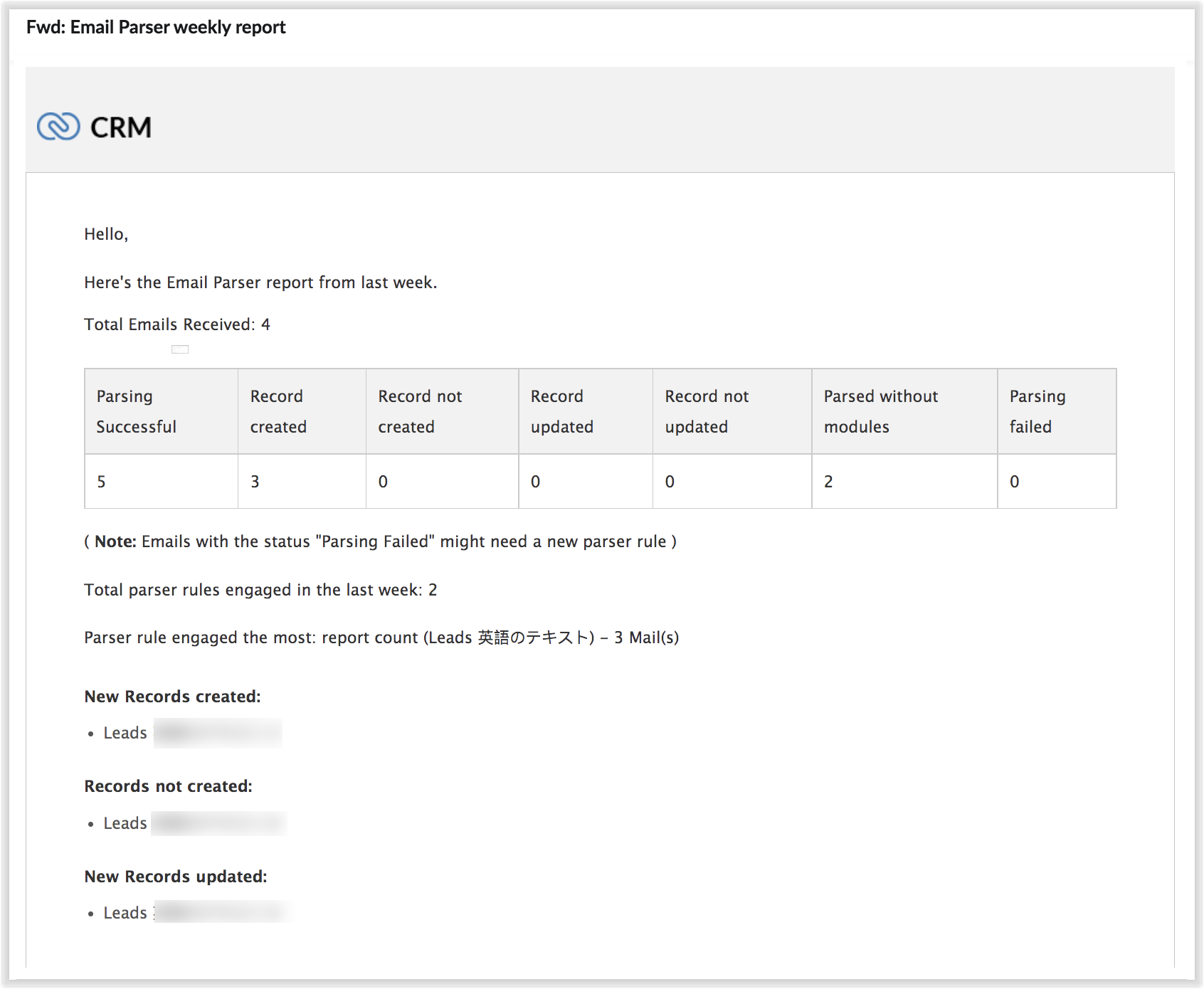 În noua versiune a email parser-ului, ți se prezintă informații precise și detaliate despre numărul de email-uri parsate per regulă, câmpurile extrase și o listă de acțiuni personalizate asociate înregistrărilor create prin parser. Acest rezumat de detalii îți oferă o imagine clară despre cât de eficiente au fost regulile tale și indică revizuirile pe care ar trebui să le faci acelor reguli pe baza informațiilor. Rapoarte detaliate de performanță săptămânale pot fi trimise creatorului acestor reguli sau la un ID de email personalizat. Rapoartele prin email sunt, de asemenea, trimise la eșecul creării înregistrărilor, astfel încât utilizatorii să poată lua măsuri imediate.