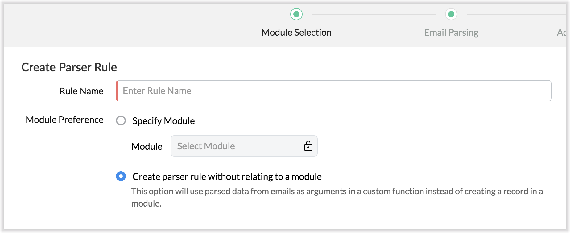 Email parser suportă acum executarea funcțiilor personalizate pe baza datelor parsate. În acest caz, regula parser-ului nu este atribuită unui modul anume. Folosirea acțiunilor personalizate te ajută cu extensibilitatea și interoperabilitatea în Zoho CRM. Adică, poți extinde funcția email parser-ului la mai mult de un modul. Poți, de asemenea, efectua acțiuni ad-hoc în aplicații terțe pe baza datelor parsate.