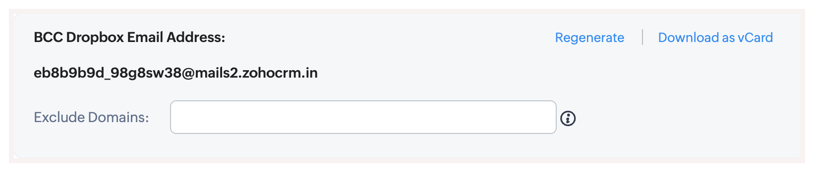 Adresa de email BCC Dropbox poate fi folosită doar pentru modulele Lead-uri și Contacte, adică poți asocia emailurile trimise doar la lead-uri sau contacte pe baza setărilor. Accesează Configurare > Canale > Email > BCC Dropbox pentru a găsi adresa ta de email BCC Dropbox. În plus, vei avea și opțiunea de a: