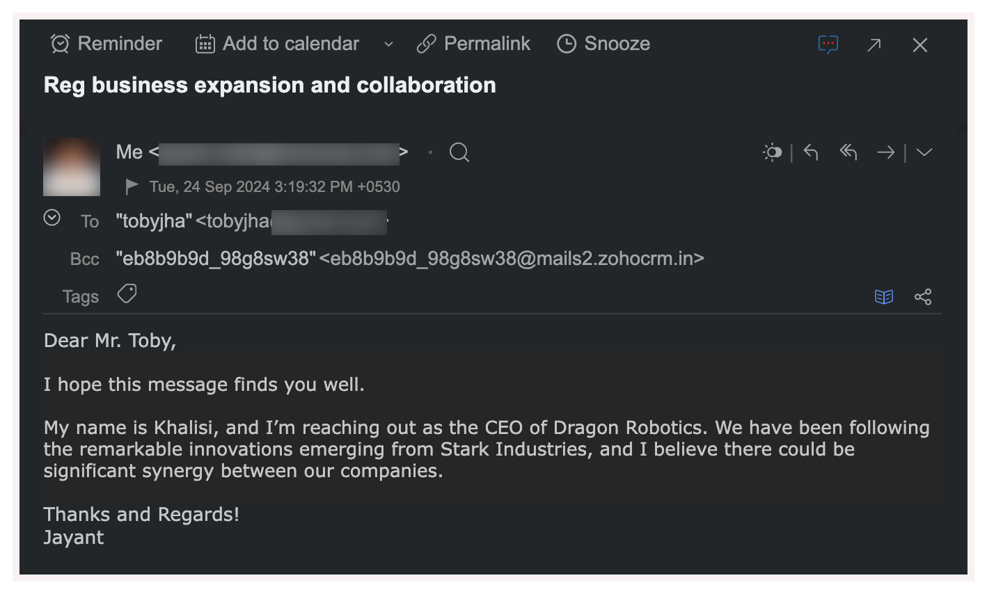 - În câmpul Bcc, specifică adresa de email BCC Dropbox. Poți obține adresa de email BCC Dropbox din Configurare > Canale > Email > BCC Dropbox.