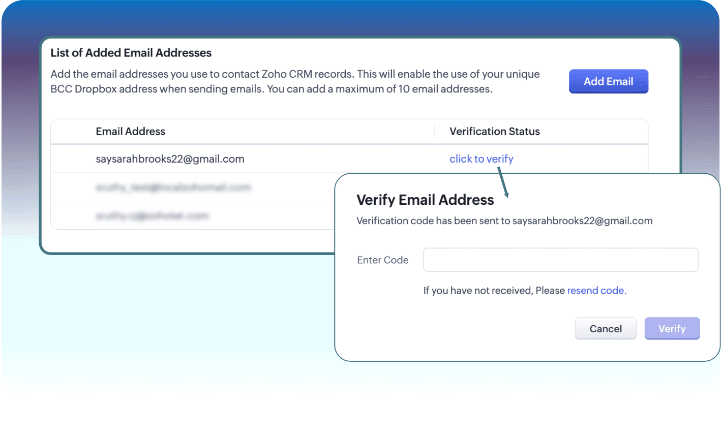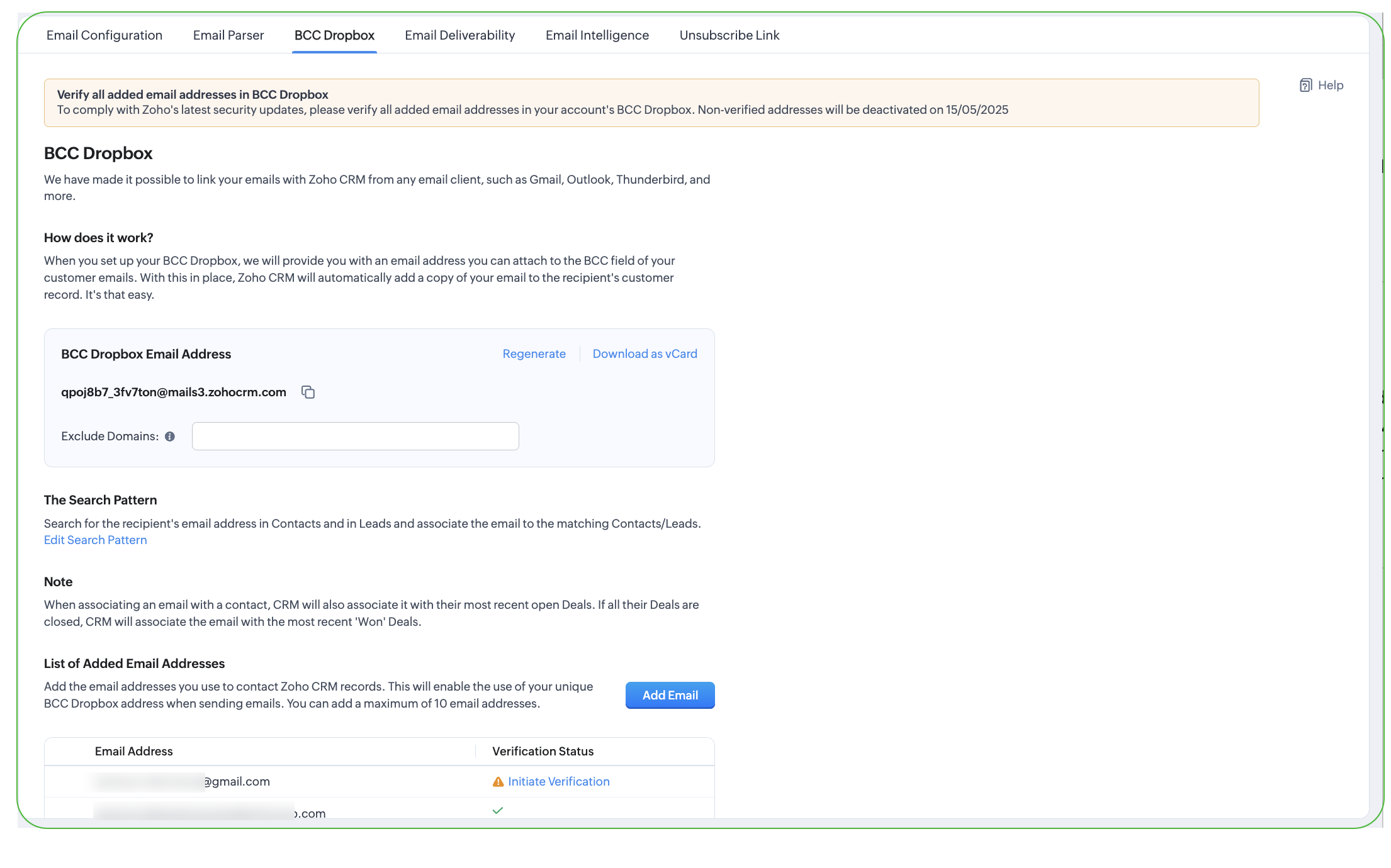 Doar acele adrese de email care sunt adăugate la lista de adrese de email verificate vor fi asociate la lead-urile/contactele din Zoho CRM.