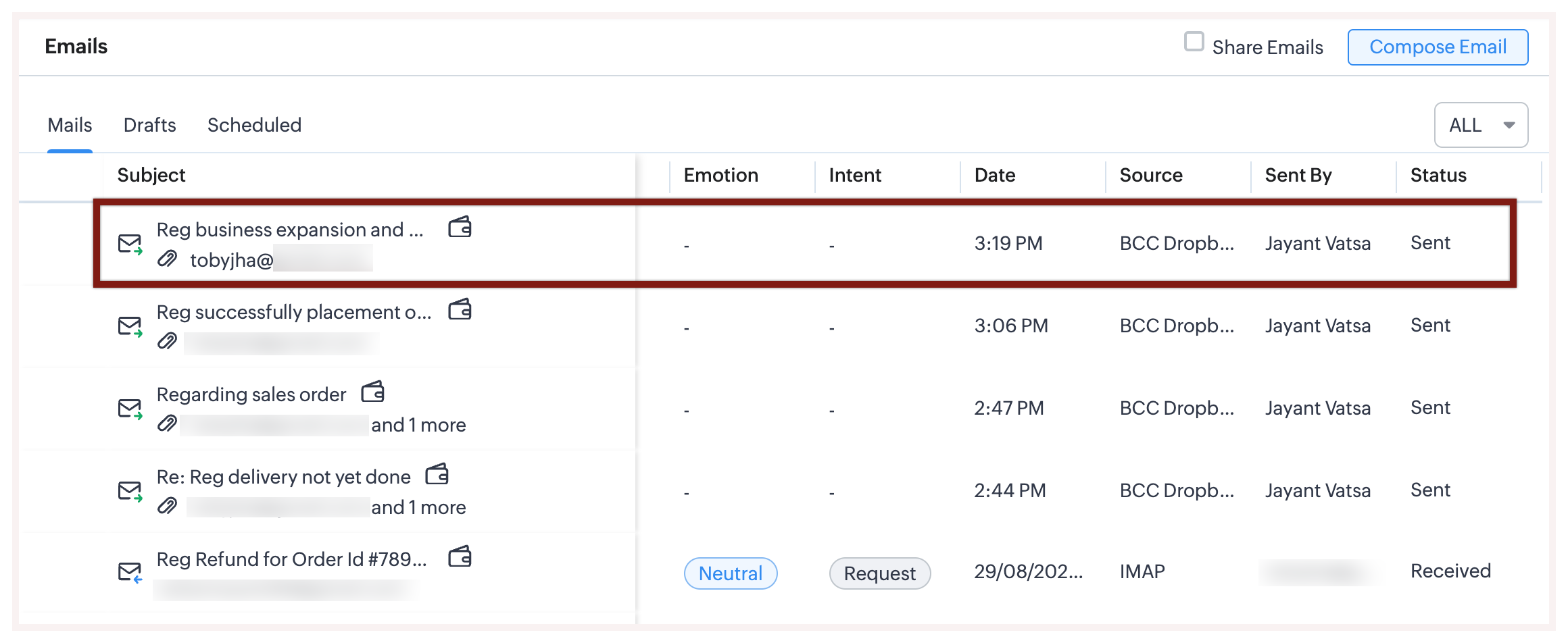- Emailurile vor fi listate sub opțiunea Emailuri trimise din CRM din lista derulantă.