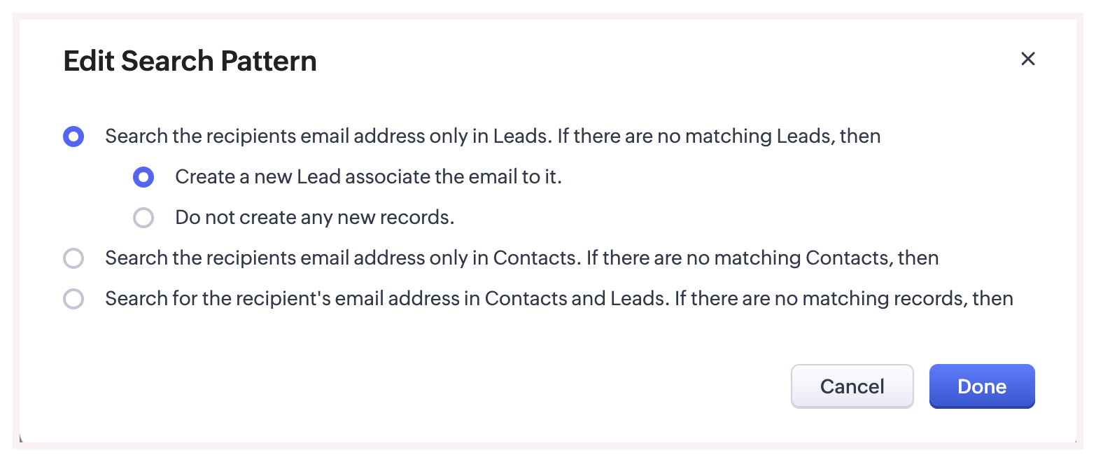 Modelul de căutare are trei opțiuni care te ajută să decizi unde să cauți adresa de email a destinatarului, în modulul Lead-uri/Contacte sau în ambele module. Pe baza acestei opțiuni, Zoho CRM va căuta înregistrarea corespunzătoare și va asocia emailul la înregistrare.