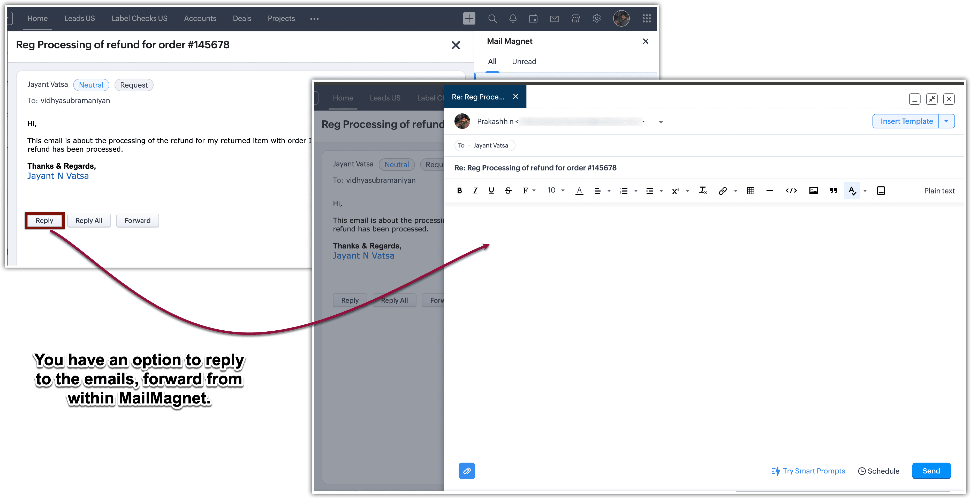 O zi tipică din viața unui reprezentant de vânzări este incompletă fără comunicarea și follow-up-urile prin email. Răspunsurile prompte la email-urile clienților sunt esențiale. Aici intervine rolul vital al notificărilor prin email. MailMagnet face exact acest lucru. Scanează inteligent inbox-ul tău și te notifică despre email-urile primite de la prospecții și clienții tăi din CRM. În plus, poți răspunde la email-uri, adăuga sarcini de follow-up și face notițe — totul din cadrul MailMagnet.