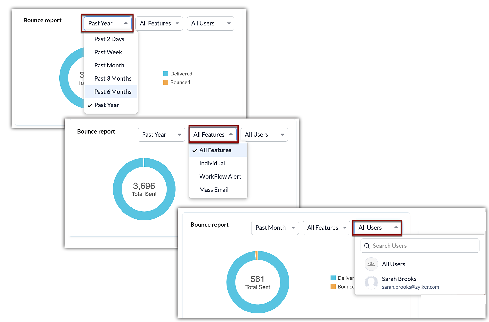 - Respingeri permanente frecvente - Deși ar putea exista mai multe motive pentru o respingere, cum ar fi adresa de email incorectă, depășirea limitelor de email, epuizarea spațiului de stocare al inbox-ului etc., respingerile frecvente îți vor afecta reputația emailurilor. Apasă aici pentru a afla cum să minimizezi respingerile de email în Zoho CRM.