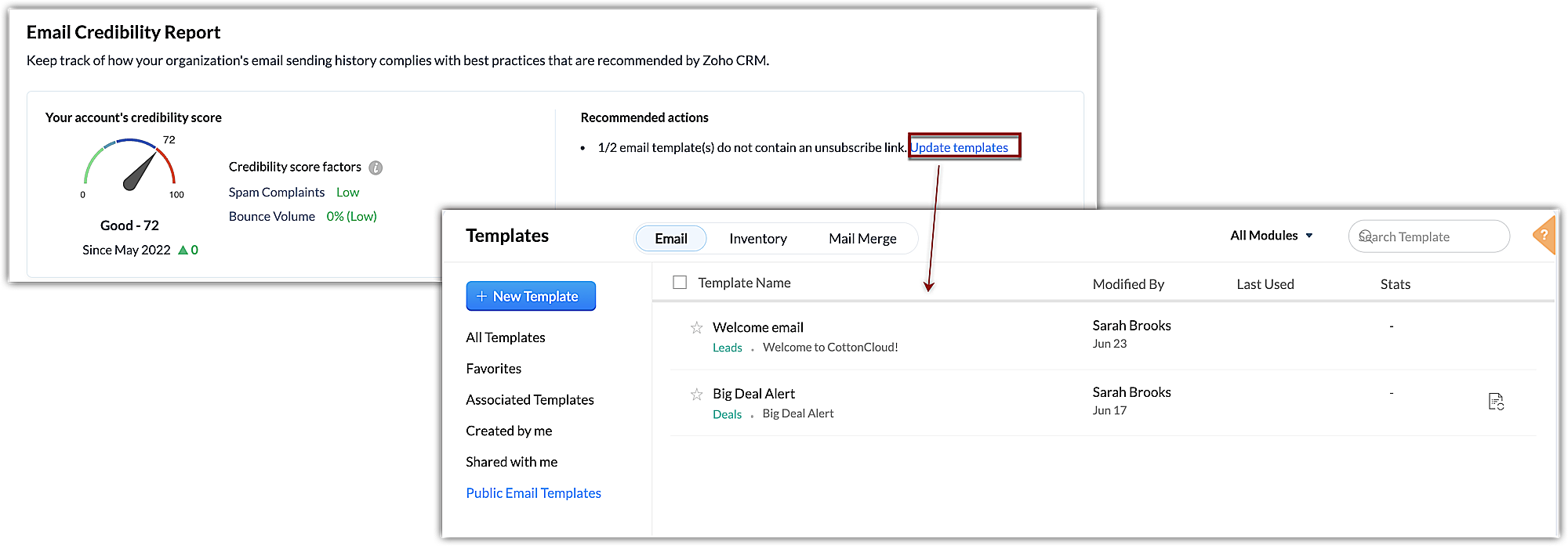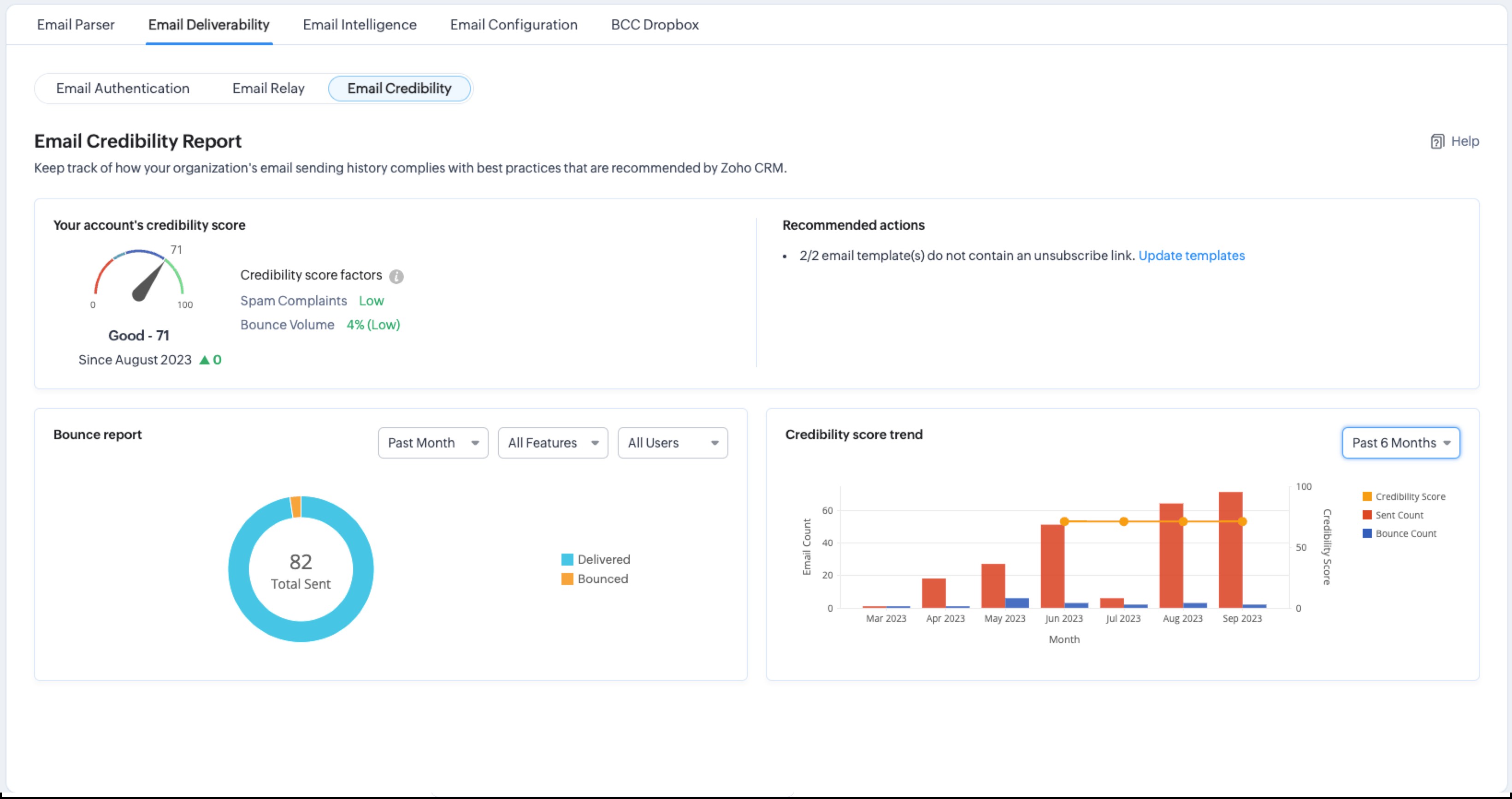Pentru a limita acest efect de domino, a ajuta la atenuarea scorurilor slabe de credibilitate și a te ajuta să îți evaluezi singur reputația expeditorilor , Zoho CRM analizează practicile tale de trimitere a emailurilor și îți oferă un raport de credibilitate a emailurilor.