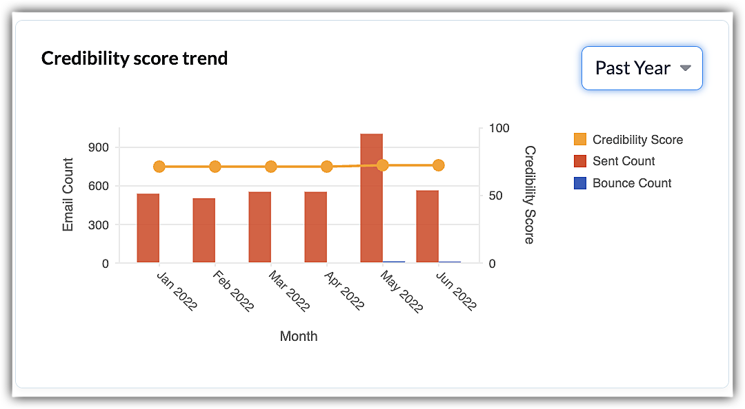 Raportul de tendință a scorului de credibilitate ilustrează cum s-a schimbat scorul tău de credibilitate în timp. Compară scorul tău cu numărul total de emailuri trimise și numărul de respingeri acumulate pentru perioada selectată. O tendință ascendentă indică practici bune de email, în timp ce un declin indică contrariul - afectându-ți scorul de credibilitate.