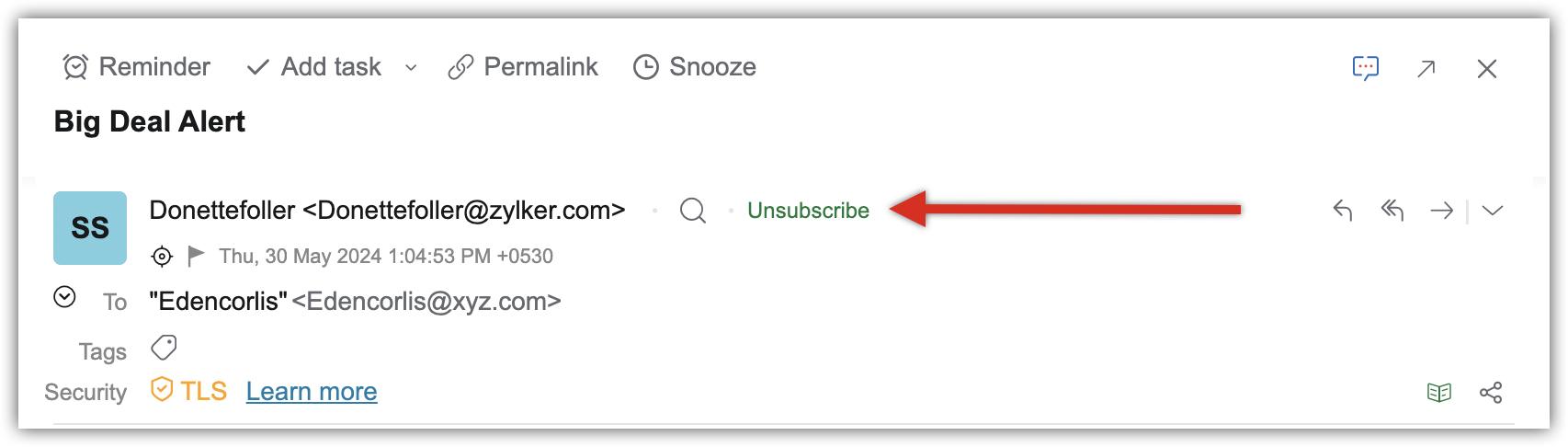 Acest pas este așteptat de la organizațiile care sunt expeditori în masă, dar recomandăm tuturor expeditorilor să utilizeze linkul de dezabonare și funcționalitățile de renunțare la email din Zoho CRM pentru a configura aceasta.