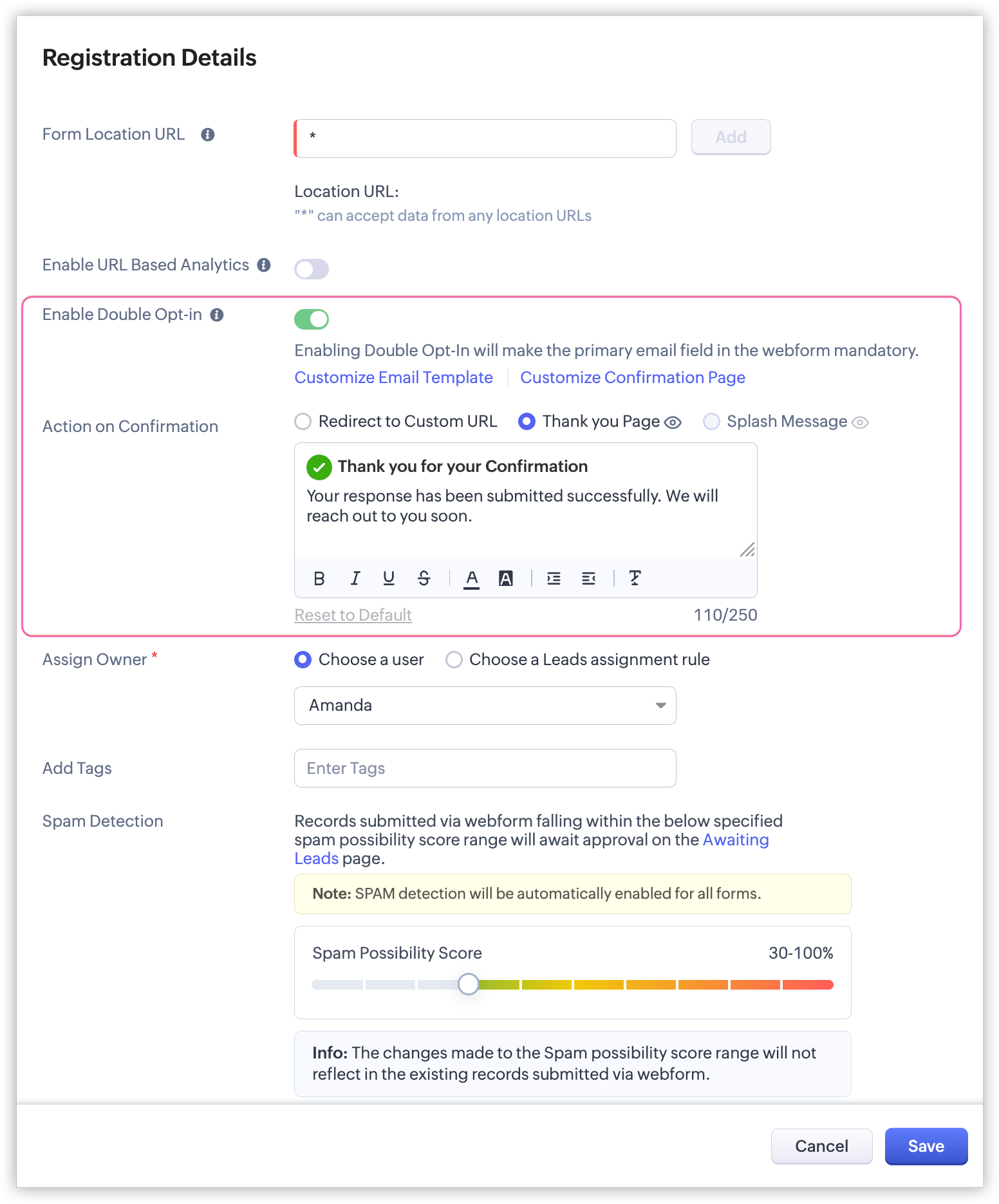 | Activează Double Opt-in | Activează mecanismul de double opt-in pentru formularele web, astfel încât clienții care își trimit informațiile vor trebui să confirme trimiterea înainte ca datele lor să fie introduse în Zoho CRM. |