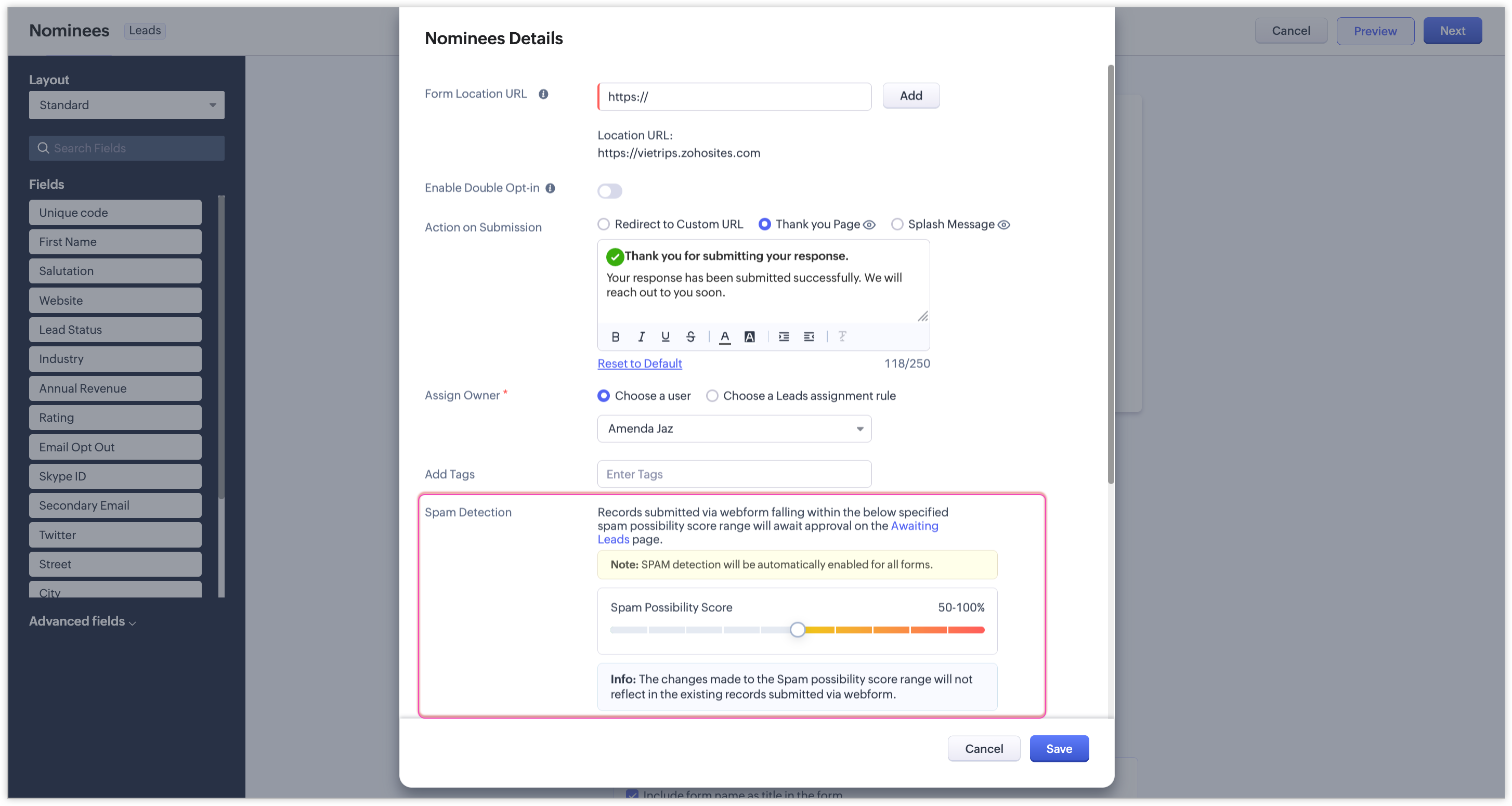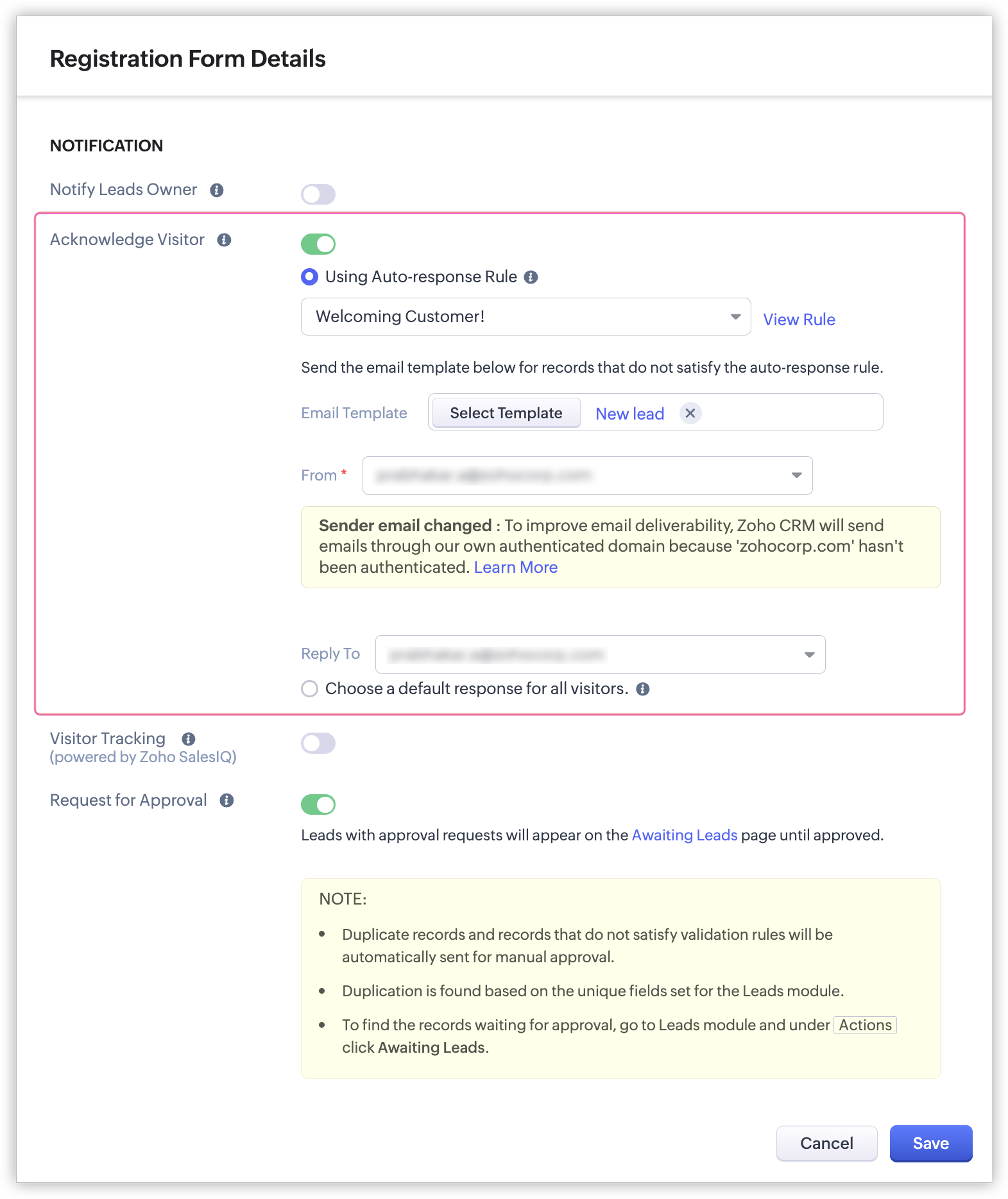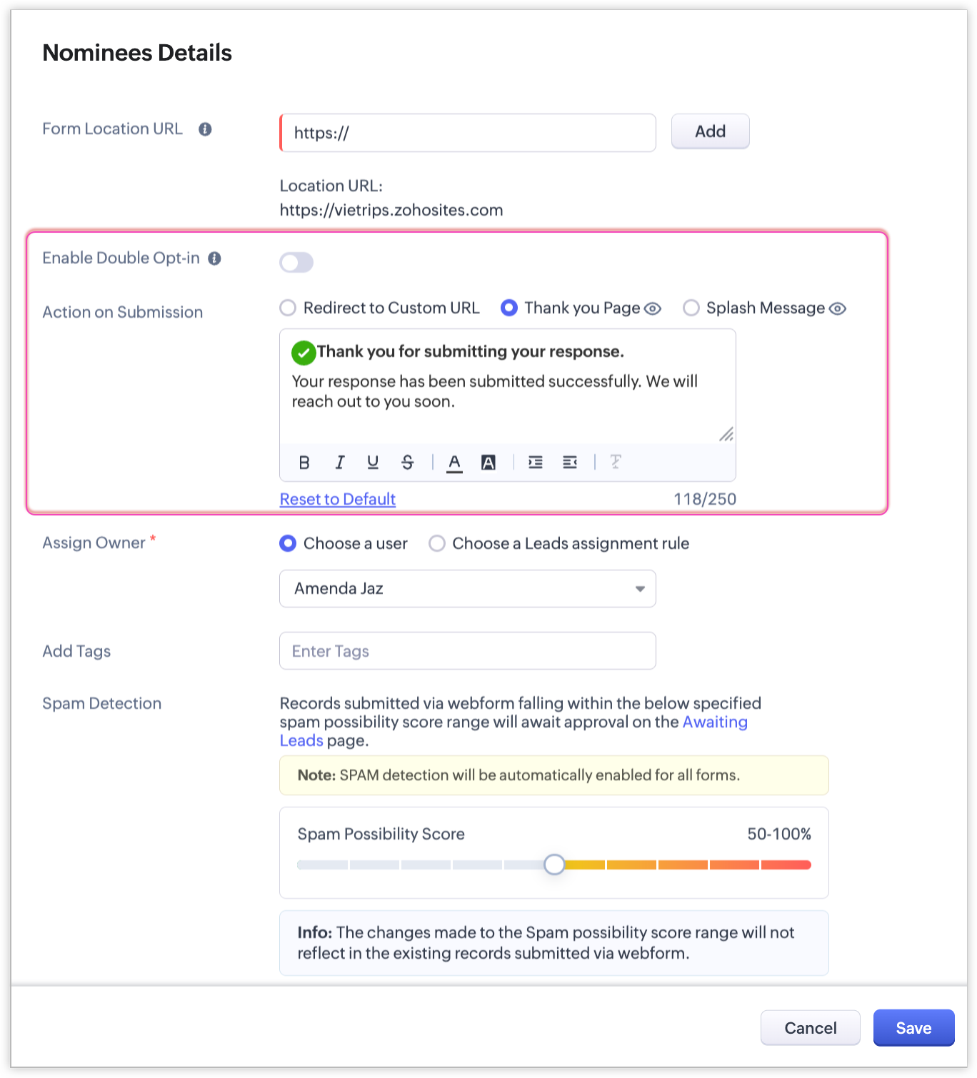 Detectarea Spam-ului se aplică tuturor modulelor suportate de formulare web și va fi activată automat pentru toate formularele pentru a detecta și preveni importul înregistrărilor spam în organizația Zoho CRM. Un scor de posibilitate spam de 90% - 100% va fi setat implicit pentru toate formularele web ca nivel de toleranță, care poate fi schimbat oricând de proprietarul formularului web. - Activează Notify [Record] Owner, dacă este necesar, și selectează un șablon de email care va fi trimis proprietarului înregistrării. Când un email de notificare trebuie trimis utilizatorilor din organizație, acesta este trimis ca notificare de la adresa de email notifications@zohocrm.com.