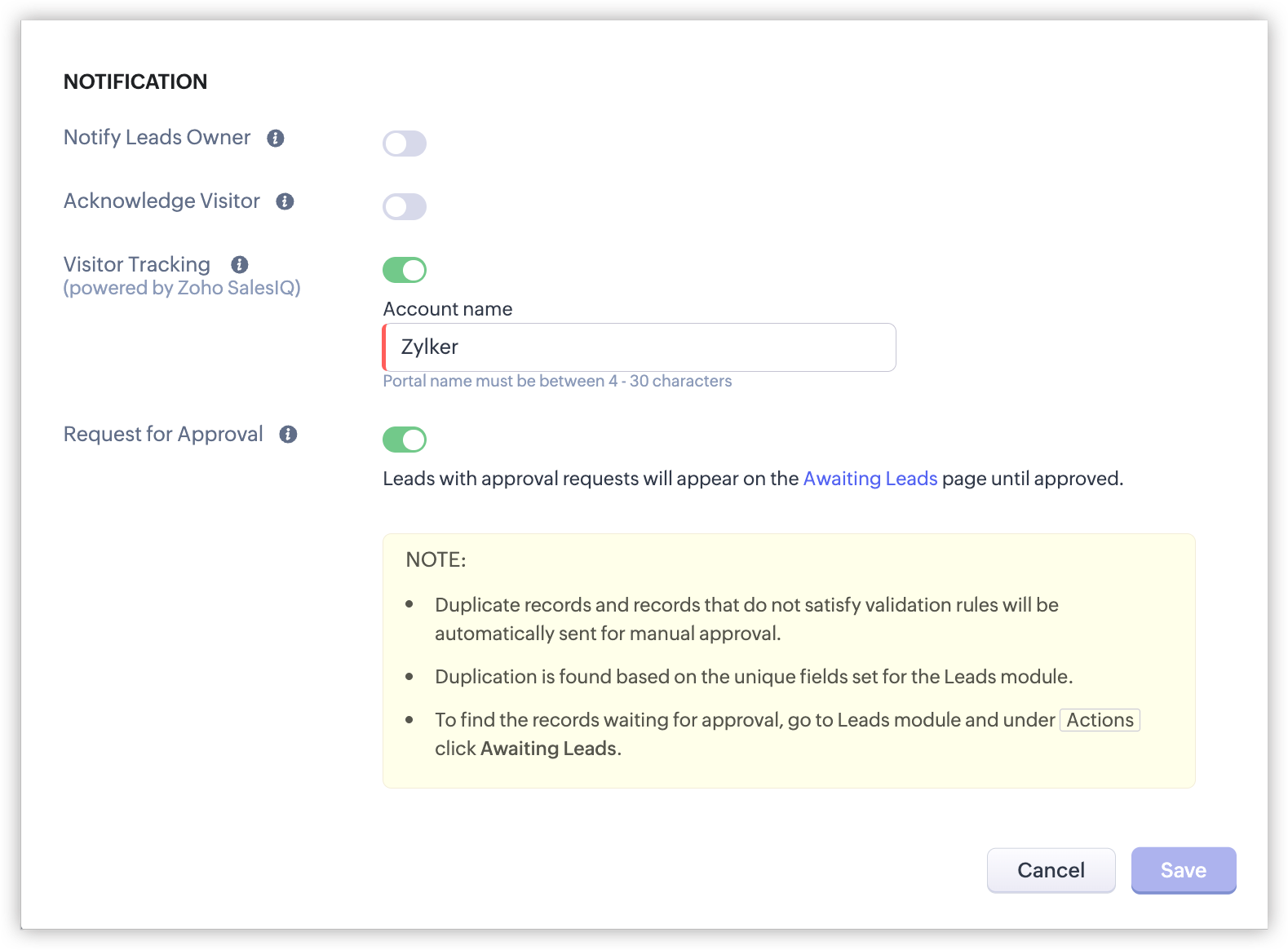 - Developer - 5 - Opțiunea Request for Approval te va ajuta să validezi manual înregistrările generate și apoi să le adaugi în modulul corespunzător din Zoho CRM. Dacă această opțiune nu este selectată, toate înregistrările generate prin formularul web sunt adăugate direct în modulele corespunzătoare.