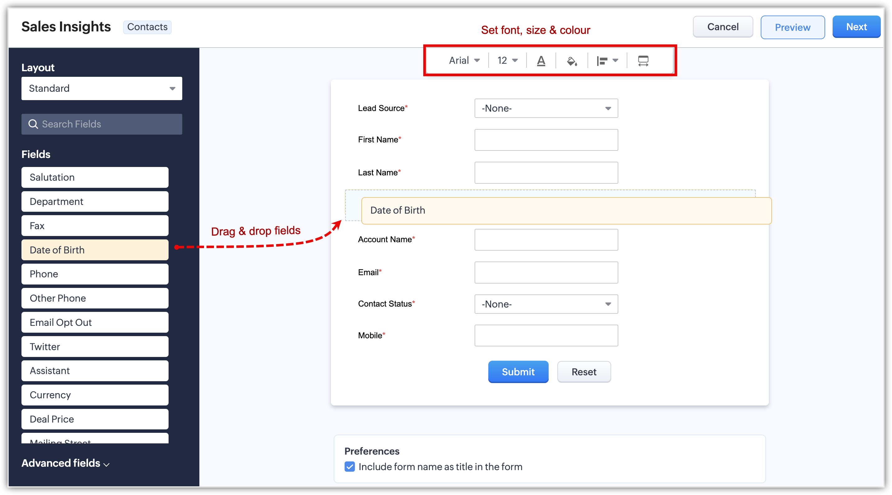 Trage și plasează câmpurile de care ai nevoie în formular și schimbă stilul și dimensiunea fontului, culoarea de fundal, alinierea câmpurilor, etc.