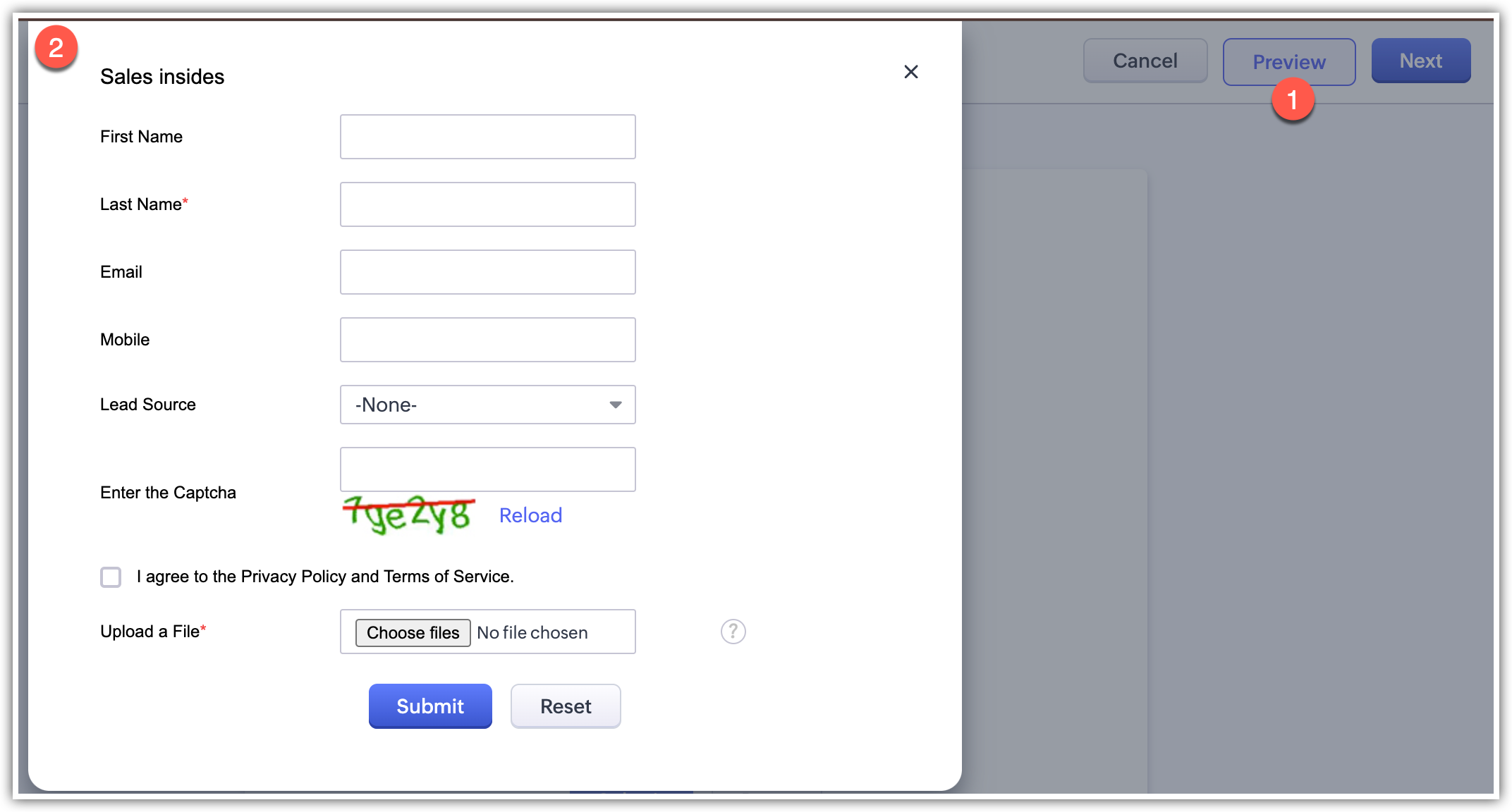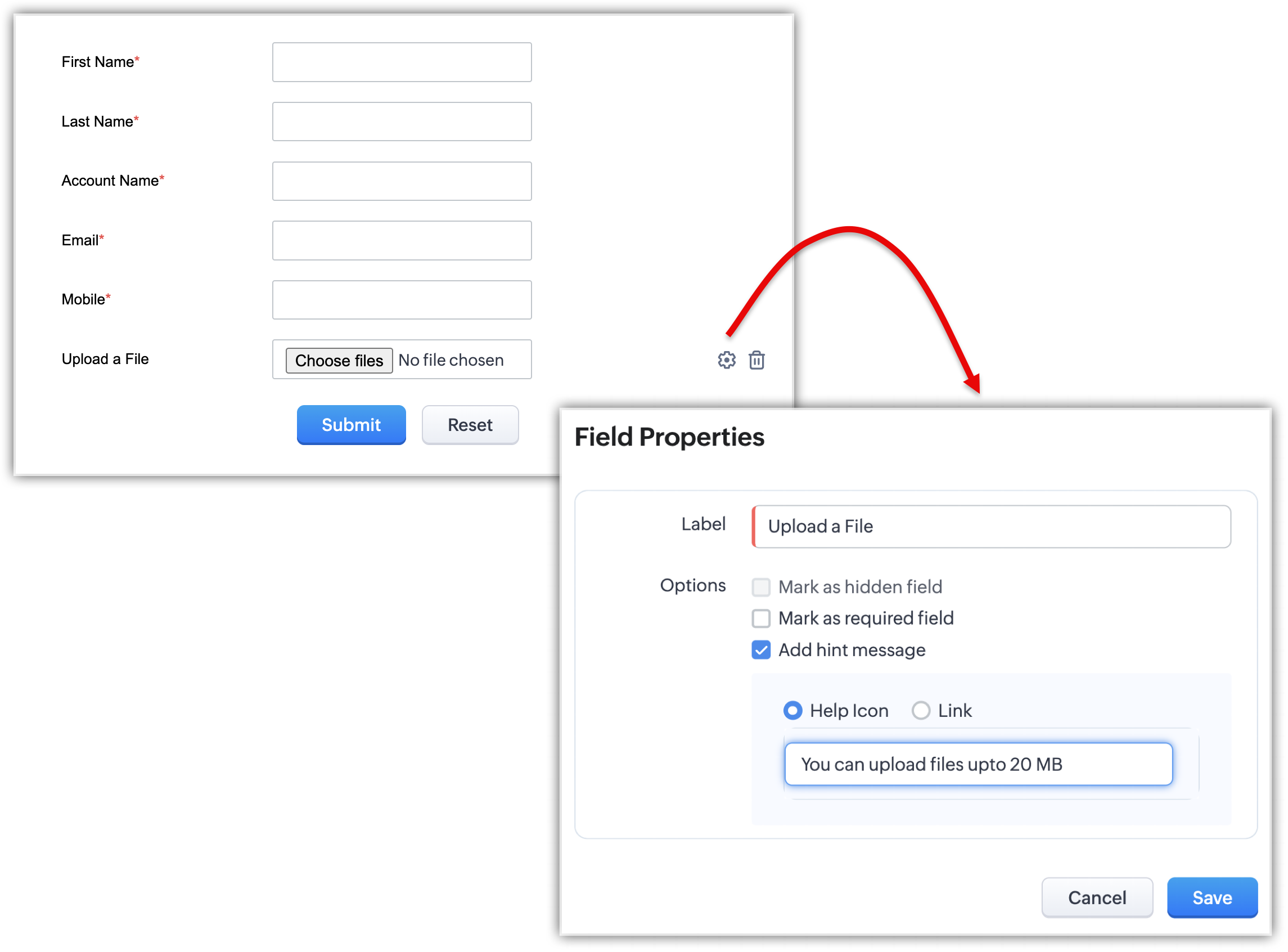 | Încarcă fișiere în formular | Capturează fișiere prin formularele web-to-lead/contact/case (sau orice alt modul personalizat), cum ar fi capturi de ecran ale unei probleme, cereri de ofertă, fotografii ale persoanelor, etc. Poți încărca până la 3 fișiere, iar dimensiunea totală a tuturor fișierelor nu trebuie să depășească 20 MB. Dacă dimensiunea totală a fișierelor depășește limita, formularul nu va fi trimis și înregistrarea nu va fi adăugată în Zoho CRM. Această opțiune este disponibilă doar în edițiile plătite. |
