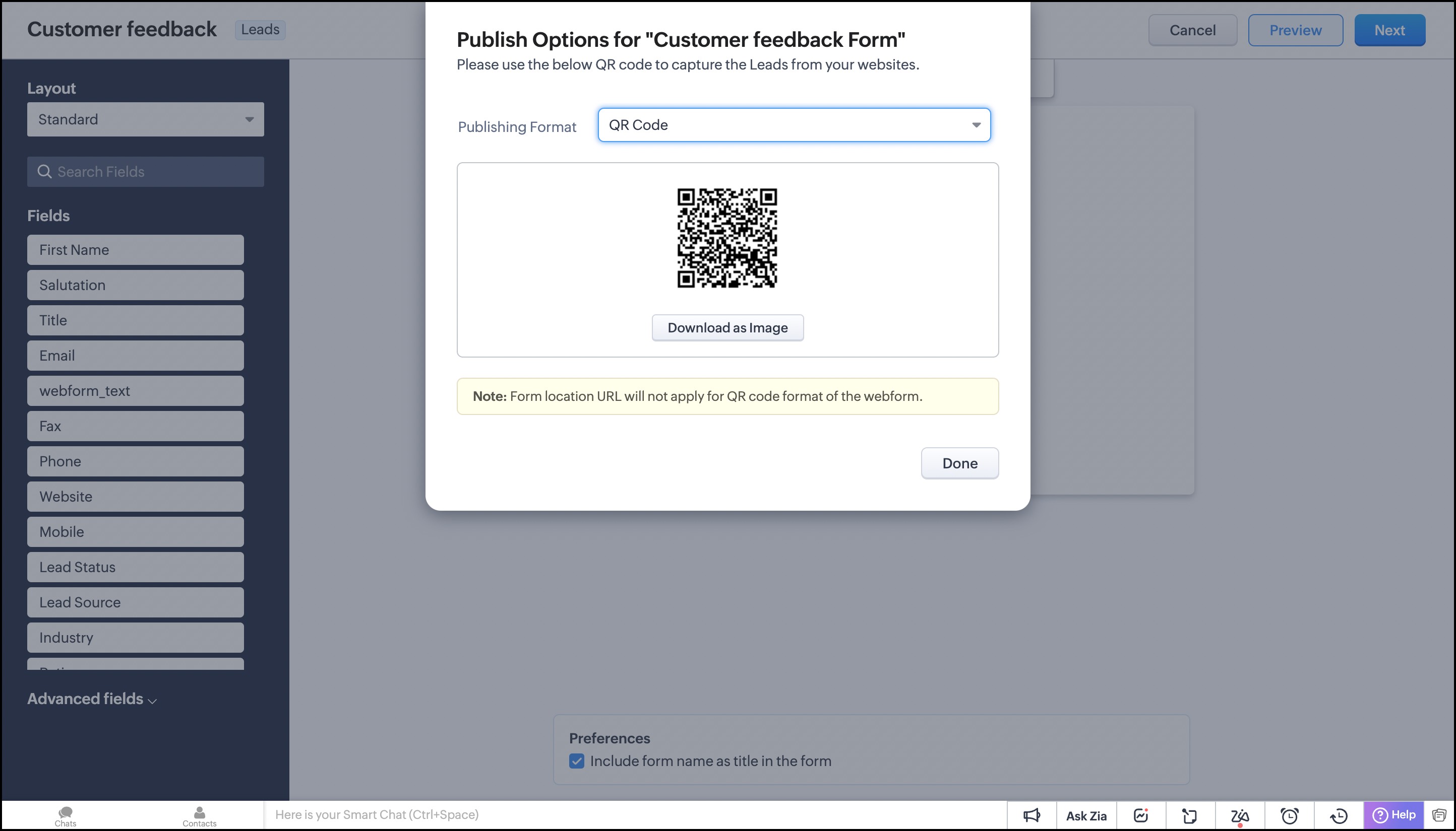 - Reține că limita pentru Form location URL adăugată depinde de planul contului tău Zoho CRM.
