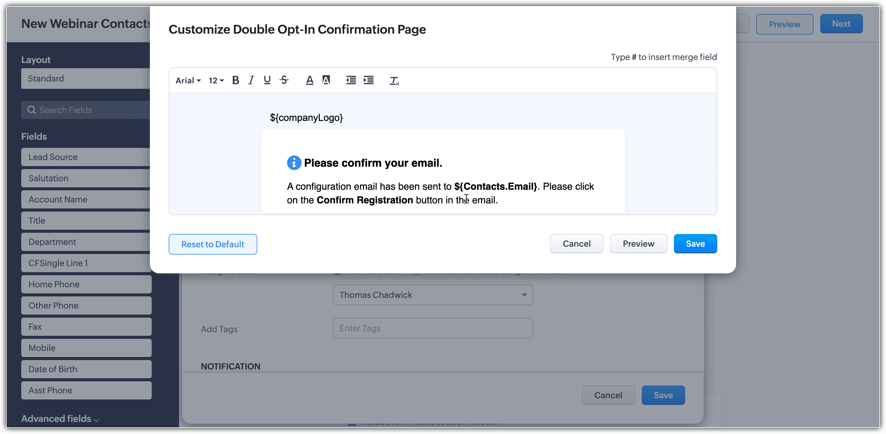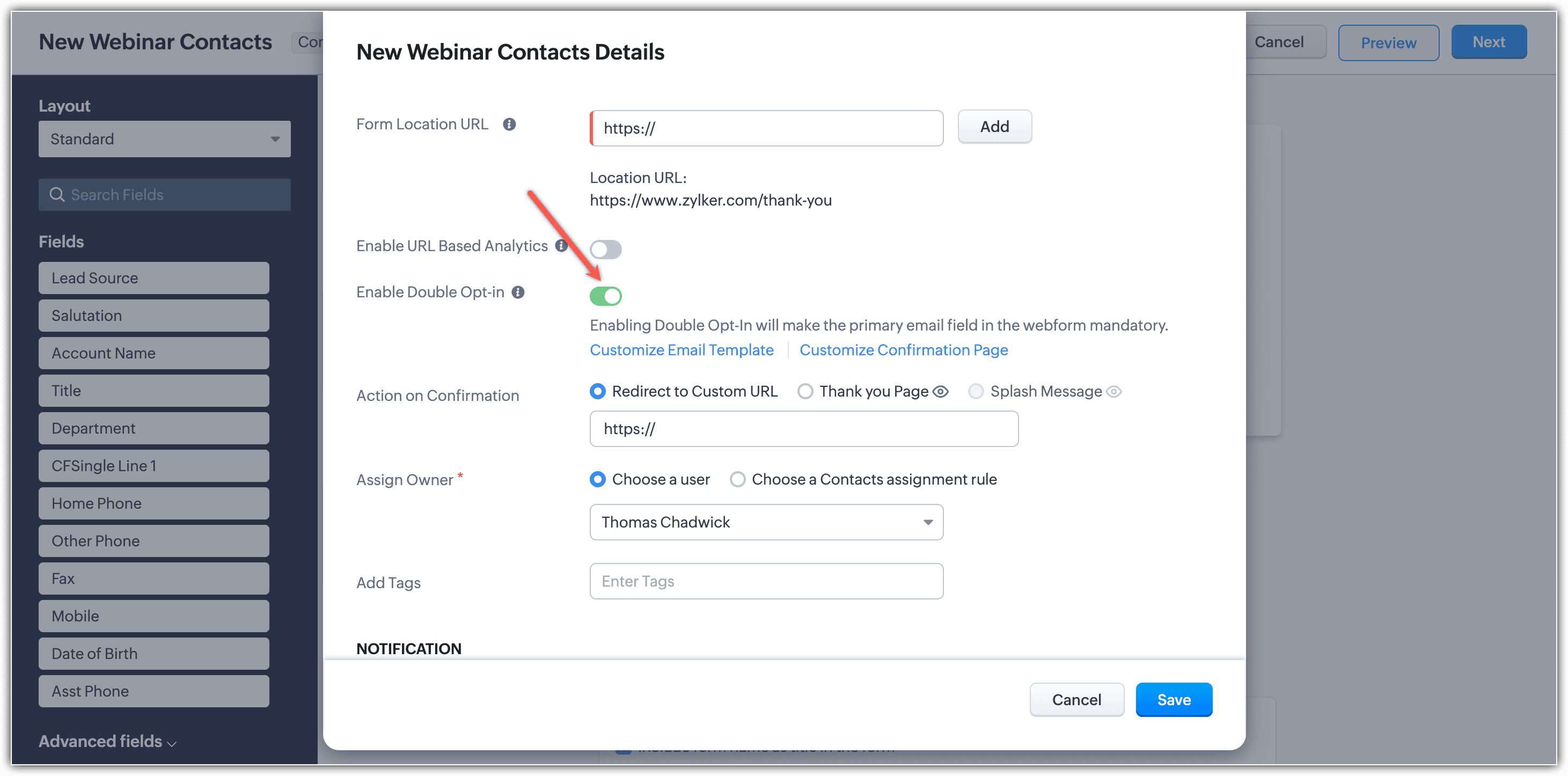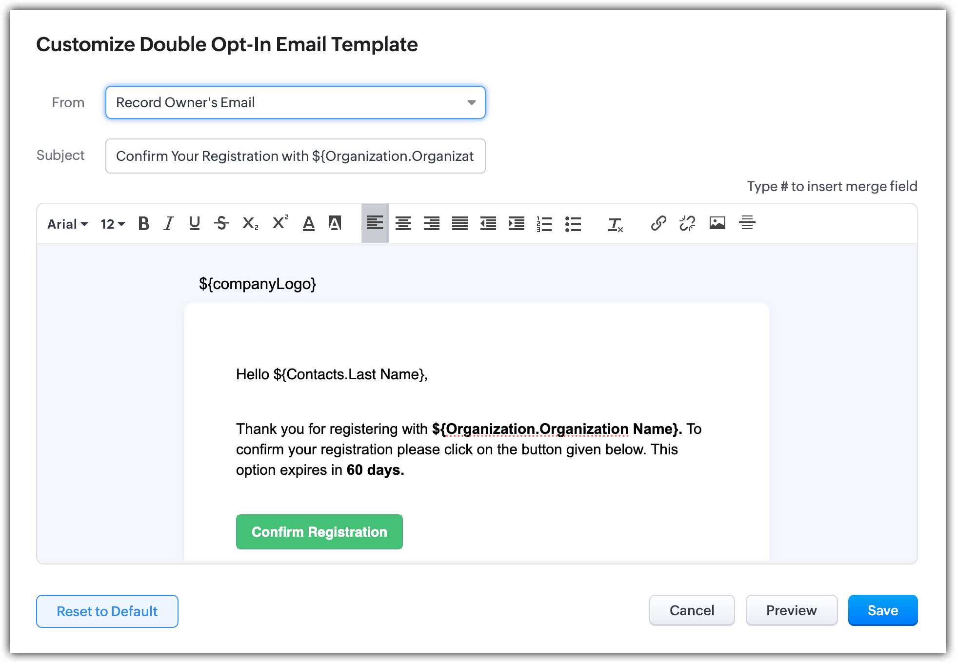 Double opt-in este un proces prin care utilizatorii confirmă de două ori că sunt interesați de ceea ce oferi și completează de bunăvoie formularul web. Te ajută să obții lead-uri de calitate și îți permite să dedici timp și resurse persoanelor care doresc să audă de la tine. Când activezi mecanismul de double opt-in pentru formularele web, clienții care trimit informațiile lor vor trebui să confirme trimiterea înainte ca datele lor să fie introduse în Zoho CRM.