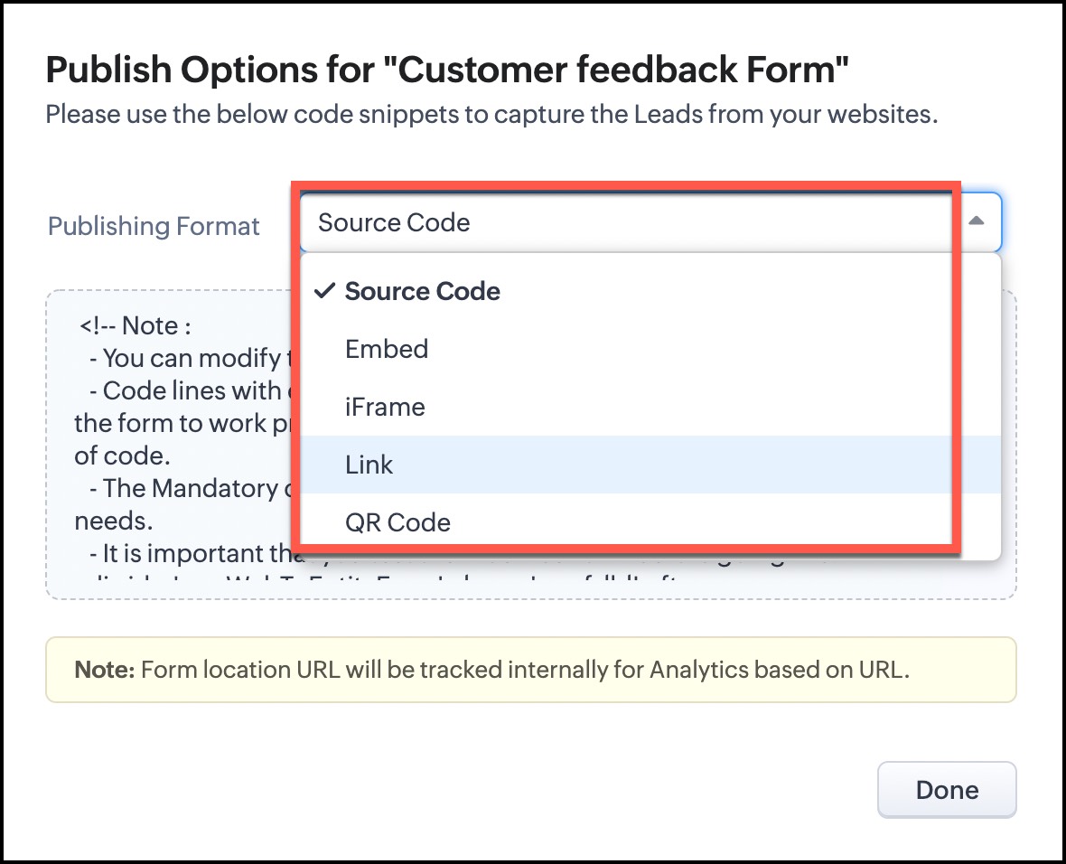 - Apasă Copy Code și Done pentru a salva formularul web clonat