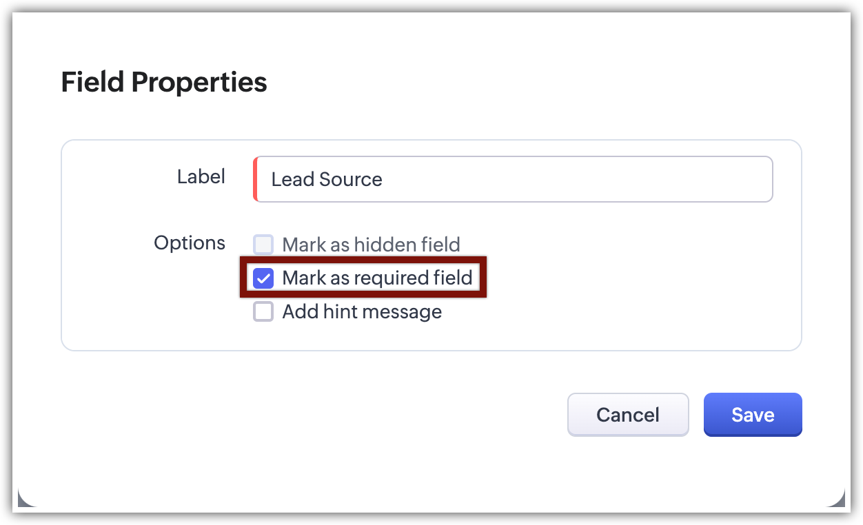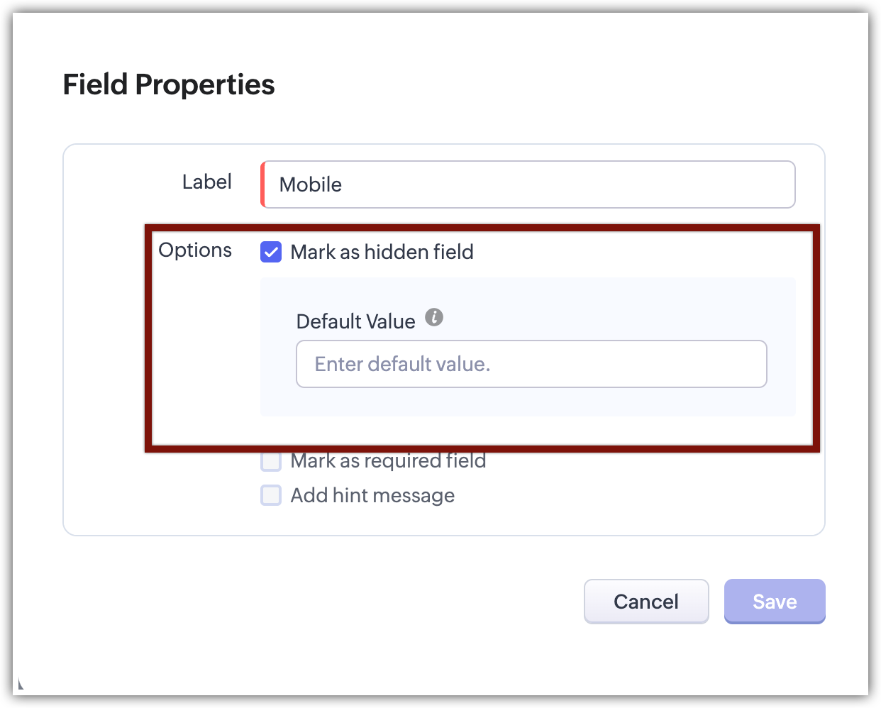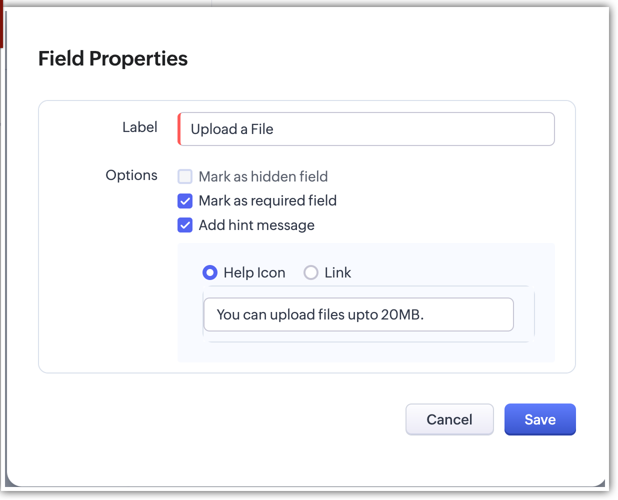 - În fereastra pop-up Field Properties , selectează caseta de bifare Add Hint Message .