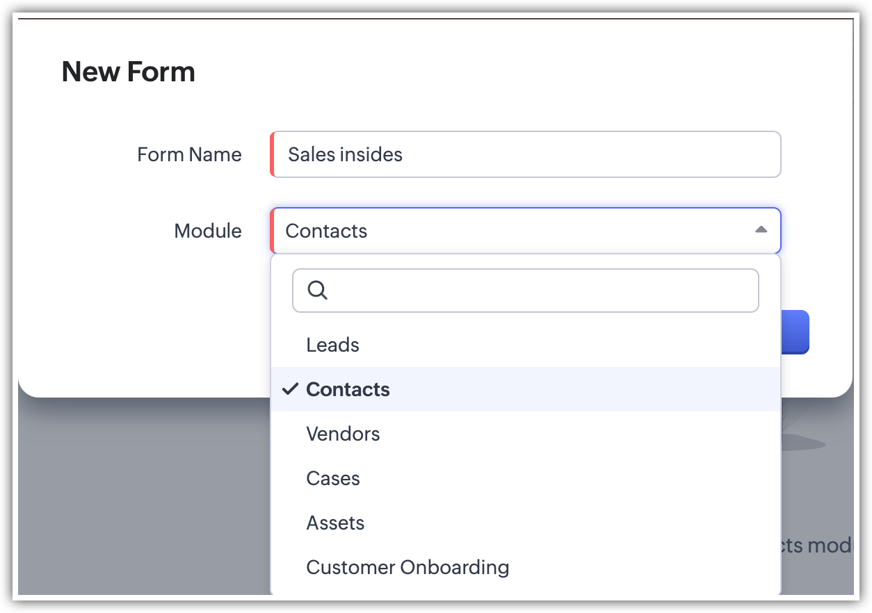 - Selectează modulul pentru care creezi formularul web din lista derulantă.