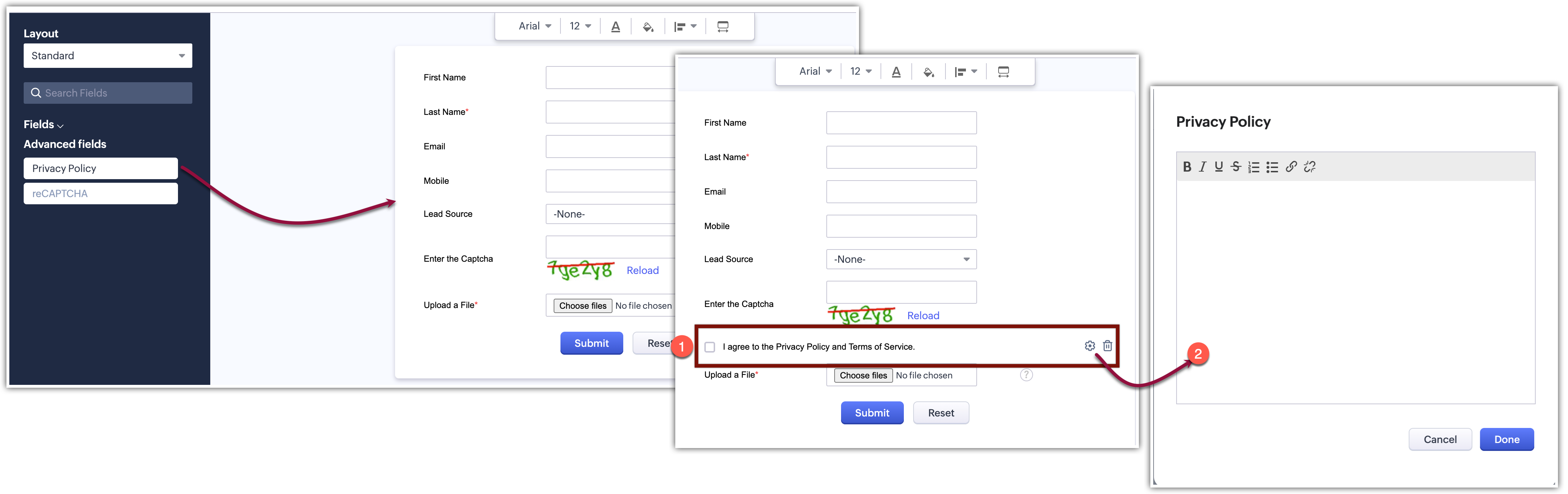 În Zoho CRM, te poți asigura că acest lucru este abordat folosind opțiunea Privacy Policy. Folosind această opțiune, poți adăuga o casetă de bifare și personaliza mesajul corespunzător. Spre deosebire de alte câmpuri de tip casetă de bifare, acest câmp are o validare; formularul va fi trimis doar după ce această casetă de bifare a fost selectată.